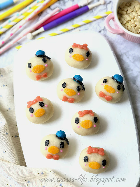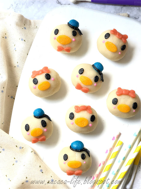 4)冰皮分成小份搓圆,压扁包入馅料收口搓圆。捏成唐老鸭造型。