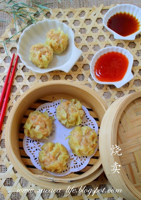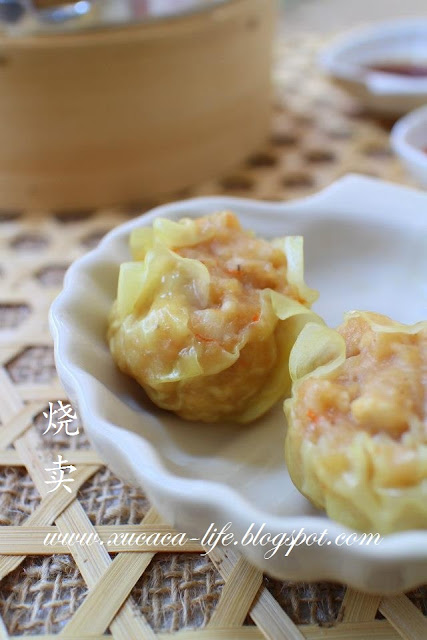 $ 0 0 很快,短短几天的假期就说过去了。每到各地游都会有新体验。可以体会到当地的生活方式、生活节奏、资讯、交通和饮食的不同。这次的广州游,不只是加重了娘子的行李,而且还为娘子添了身上的体重呢!这当然不是一回来就马上下厨的。这道烧卖是旧作,把它储存在“储藏室”里。现在才附上食谱和大家分享。嘻。嘻。嘻。简易烧卖材料:无肥猪肉 150克 (搅碎) 虾仁 250克 (搅碎) 马蹄 5个(洗净,切碎) 盐(一点点)云吞皮 (大约 20个)*鼓励用圆形的,比较好拿捏* 调味料:酱青、胡椒粉、麻油、玉米粉(适量) 做法: 1)将肉和虾仁搅碎。加入少许的盐,搅拌后,再加入切碎的马蹄。2)加入其他的调味料,将所有材料一起搅拌均匀。 (调味料自行调理,口味个人而定) 3)将拌好地馅料放入冰箱1-2小时后才包。 4)用一片云吞皮包一个烧卖,涅成烧卖形。 5)然后用大火蒸大约8-10分钟至熟变可。Enjoy!