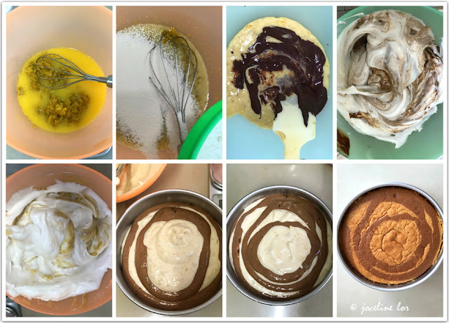 7)蛋白霜分成2份,各分开混合在蛋黄面糊里。