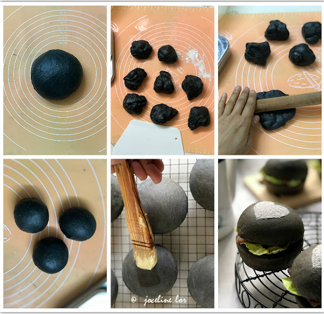 5)面包取出烤箱,表层涂上一层牛油或鲜奶。把面包放在晒网上待凉后,中间切开,夹入馅料即可。