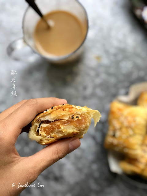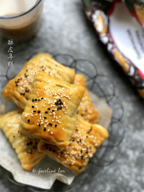 $ 0 0 收了两个月的年糕,终于可以一个一个把它消化掉了。这次选择了无油烟、零厨艺做法最靠谱。酥皮年糕材料:年糕(切片)市售酥皮表层涂面:鸡蛋液、芝麻粒【做法】1)市售酥皮割线或无需。2)将一片年糕放入然后把酥皮折起包好。往底部收口。放在烤盘上。3)表层涂上鸡蛋液。撒上少许芝麻粒。4)预热烤箱。送入烤箱170度烘烤大约25-30分钟至酥皮变得金黄色或酥脆即可。外酥内Q的口感。咬下去,感觉好像夹了麻薯(mochi)。