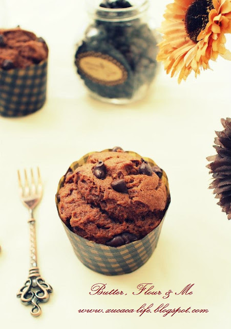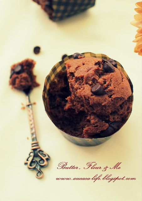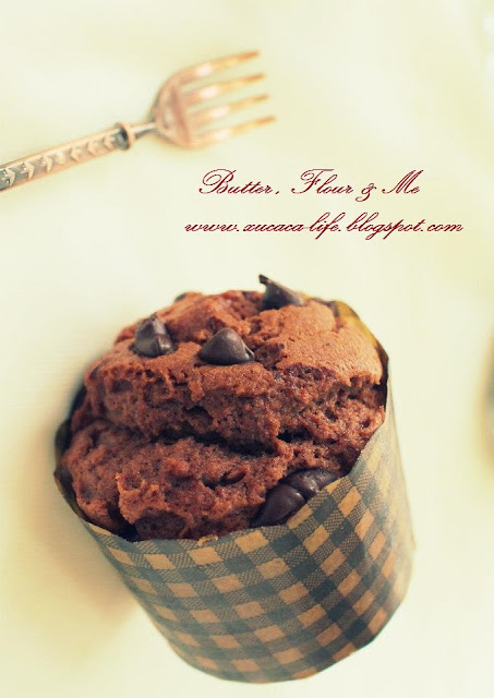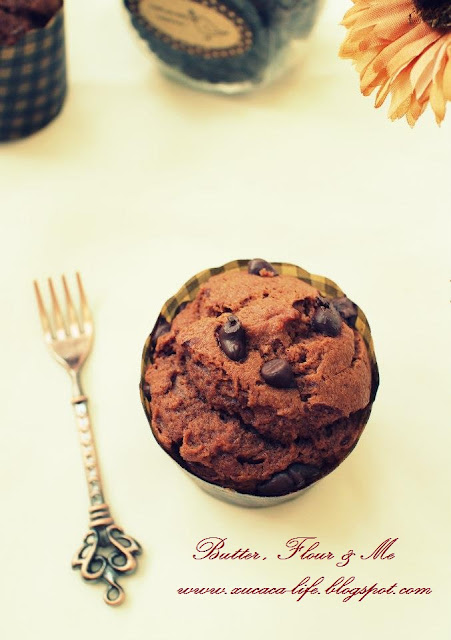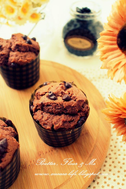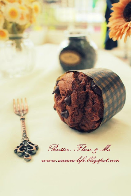5)把面糊倒入纸杯里大约7-8分满。表层撒上适量的巧克力豆。