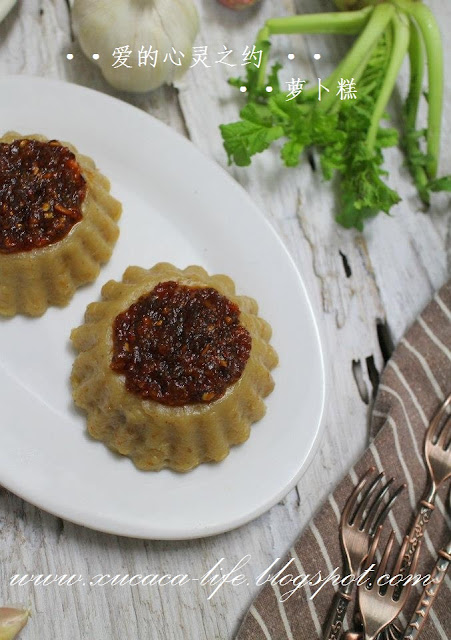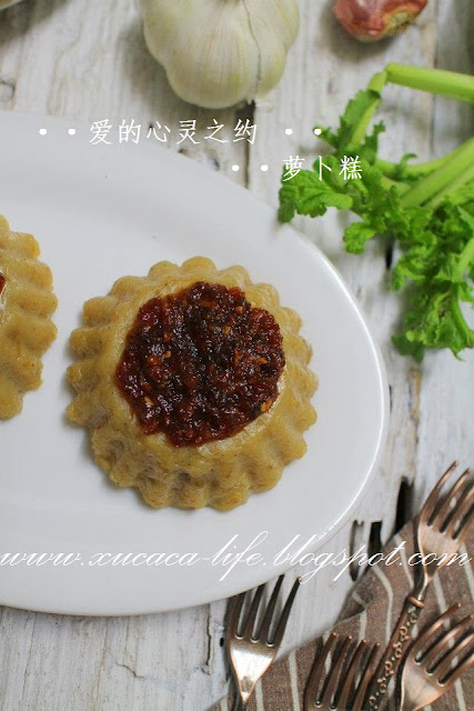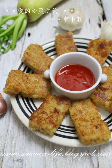 3)可以在调味料里,多加1/2汤匙的油。建议用不粘锅把萝卜糕煎香。这也不需再锅里加油煎了。因为蒸出来的萝卜糕已经有油了。所以很容易操作,肯定不粘锅。
