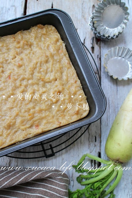 6)方模里抹上一层油。将萝卜面糊倒入方模里。以大火蒸大约40-45分钟即可。