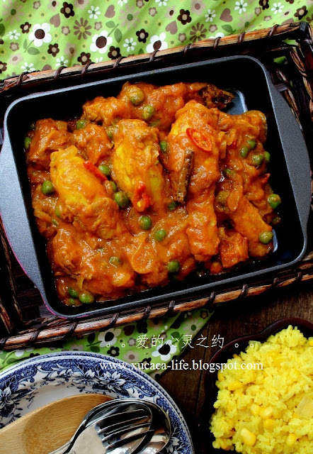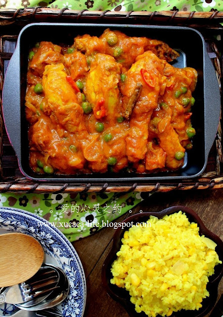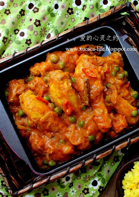 4)把材料(d)加入(除了青豆),再加入半熟的鸡腿,煮至酱汁稍微收干,然后才加入青豆,即可。