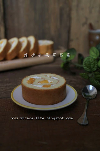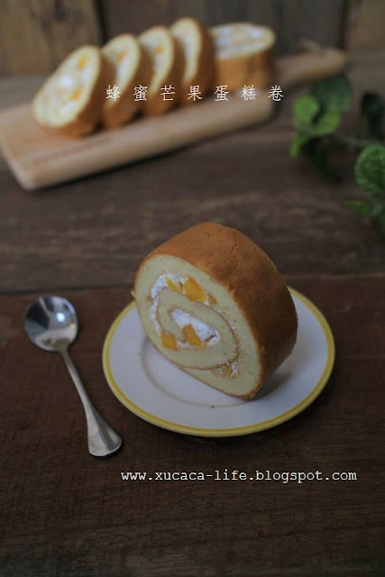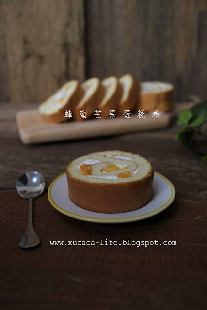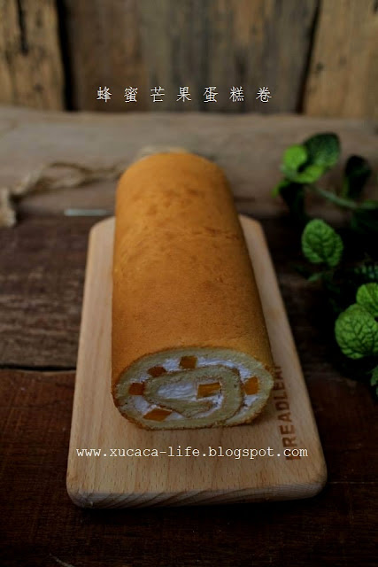 8)鲜奶油打发。把奶油涂上,然后放上适量的芒果丁。用外卷法卷上。包好放入冰箱定型后才切开享用。