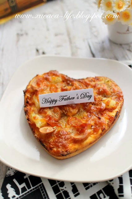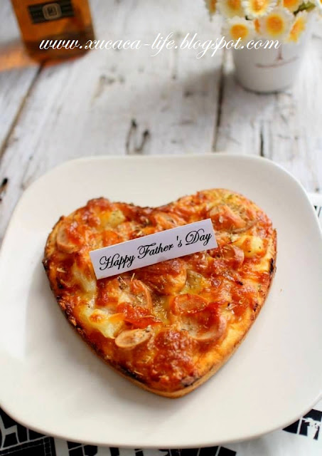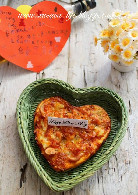 今年相公的父亲节没有准备蛋糕。只好以‘爱心’pizza代替。嘻。。嘻。。嘻。。
