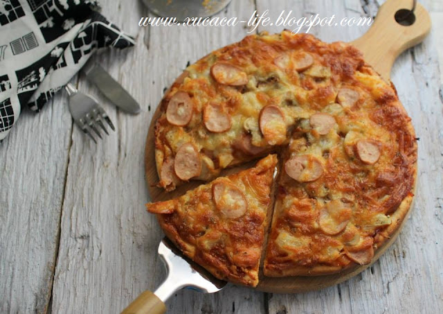 5)铺上自己喜爱的馅料。香肠、蟹肉、肉碎、海鲜类、蘑菇、水果都可以的。