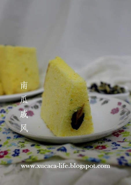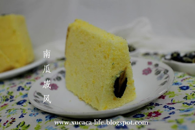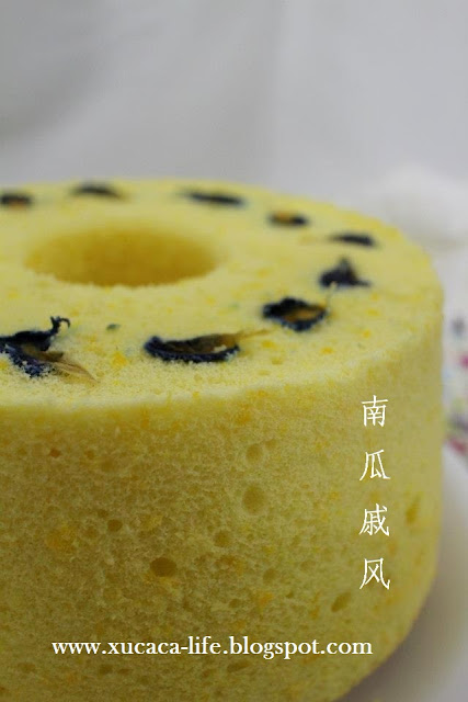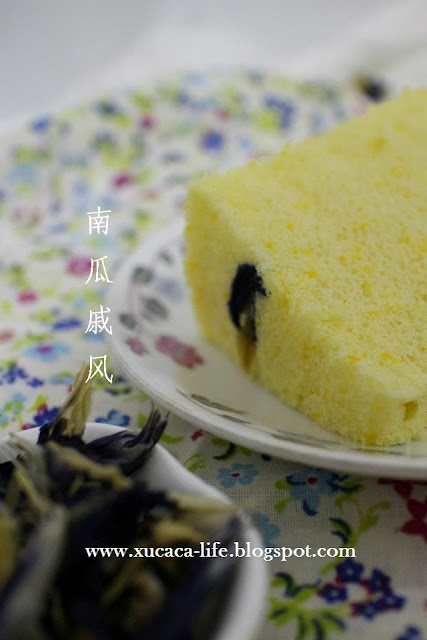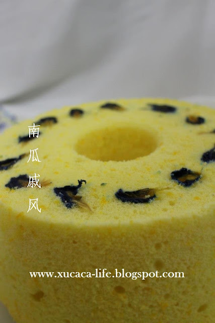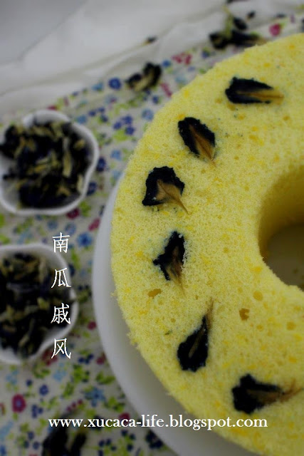 再次也把蓝花瓣加在南瓜戚风当装饰。