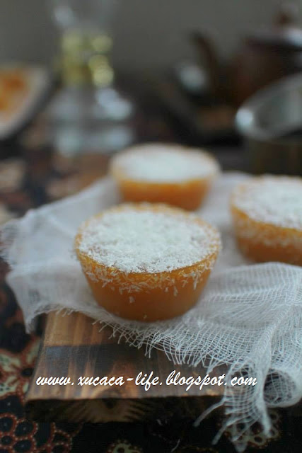 仔细一看原来是蒸南瓜糕。然后可以点上椰丝一起吃的 kuih。