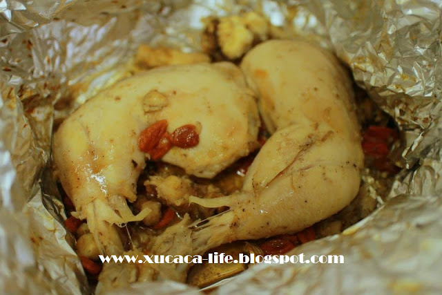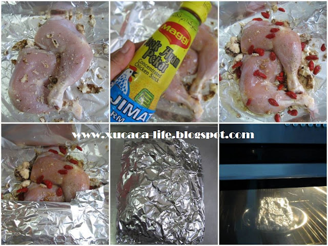 1)把鸡腿放在锡纸里,涂上一点点地盐巴。再将maggi鸡精涂上鸡腿上。两边涂均匀。把所有材料、调味料加入。