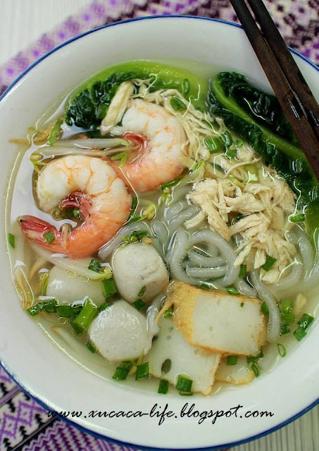 赖粉、鱼饼、鲜虾、鱼丸、芽菜、鸡肉丝、生菜