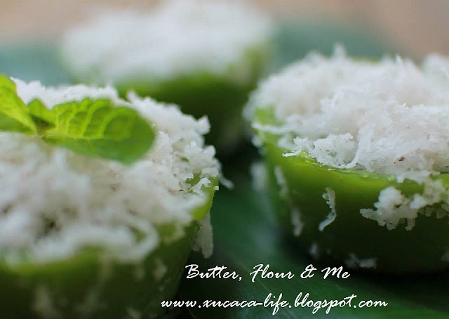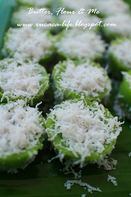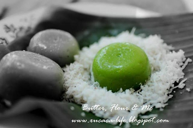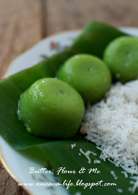 5)蒸好后,把pandan糕取出。将椰丝放在pandan 糕上一起吃。