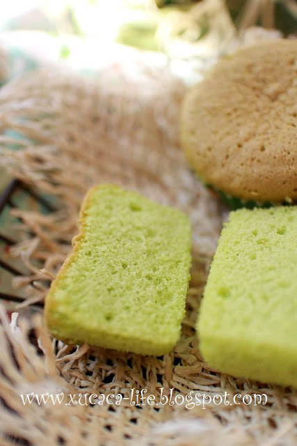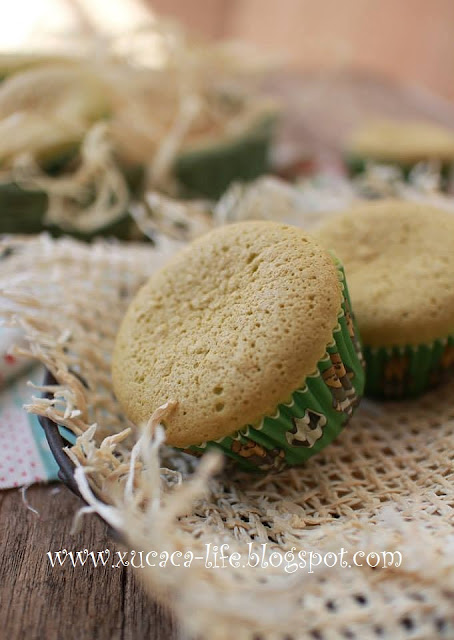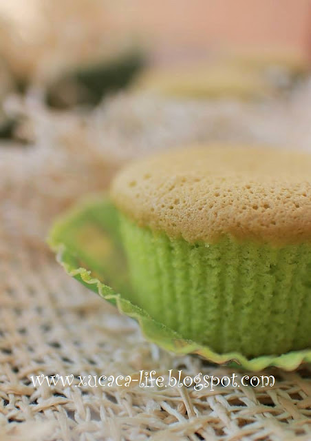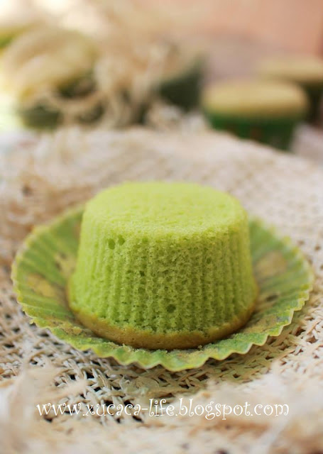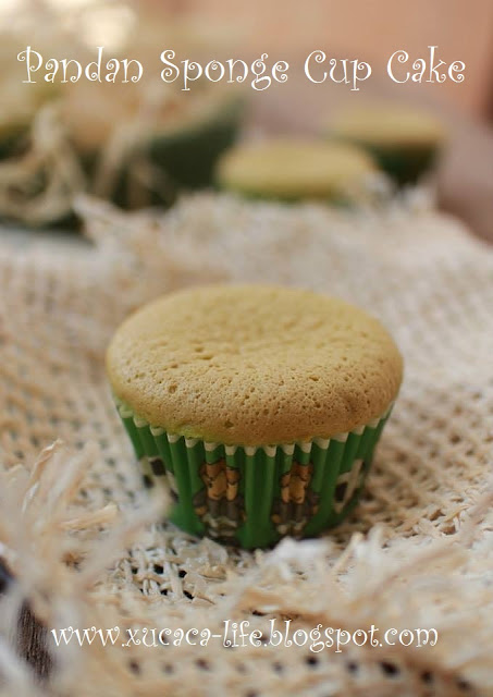 这次换汤不换药,用了同样的食谱,用了pandan精华来代替鲜橙汁,做出了pandan口味的小蛋糕。