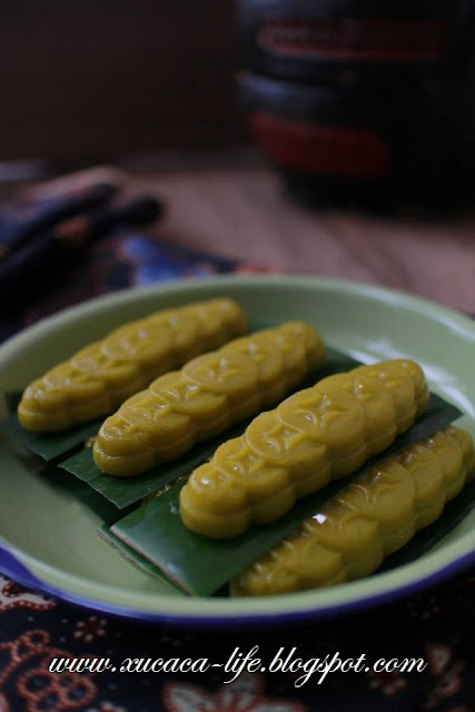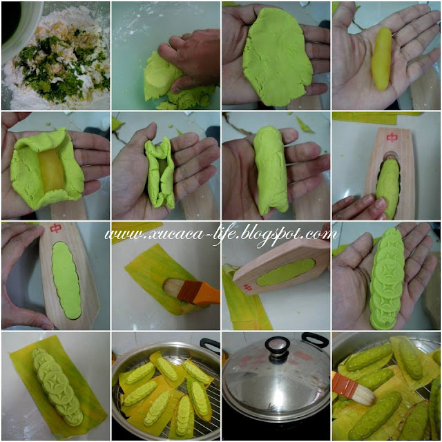 3)把面团包入馅料,搓成长型。木模撒上少许的糯米粉,把面团放入模子里压平,把面团敲出。放在一片抹上少许油的香蕉叶上。