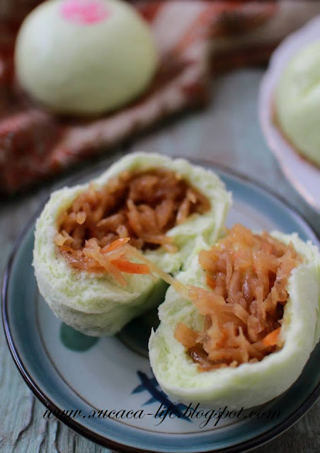 3)把面团分割成小份面团。用木棍杆平。包入适量的沙葛料,然后把包好的包子放在一小张纸上或香蕉叶上。(无需涂油的)