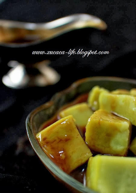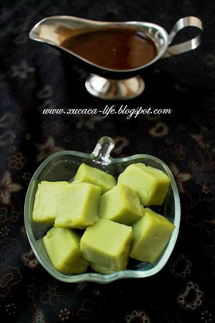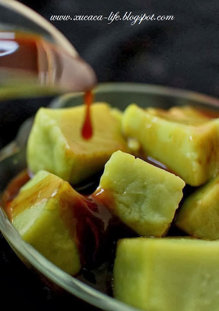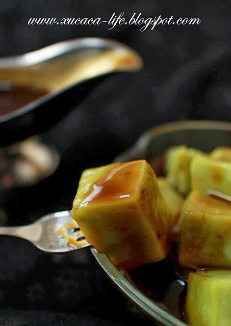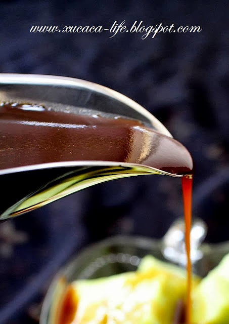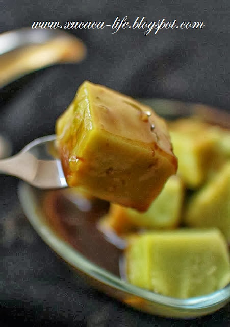 6)然后淋上椰糖浆一起享用。这个糕点可以放入冰箱后才享用。冰冷的感觉,口感和味道又不同。