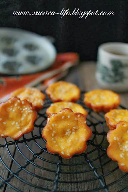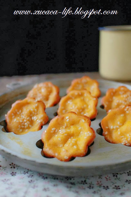 4)用汤匙把南瓜面糊舀进bahulu铁模里。表层撒上少许的被芝麻粒。