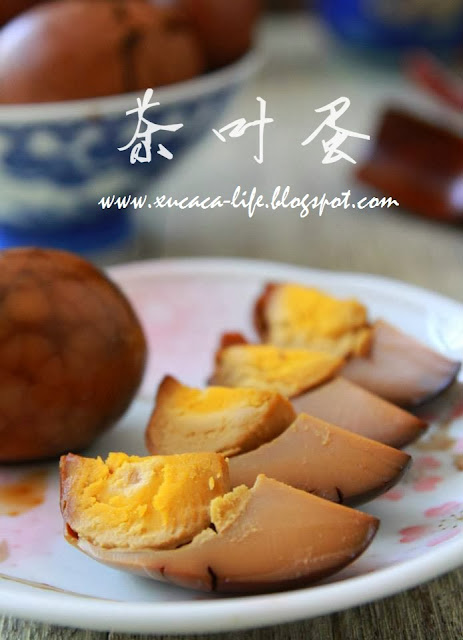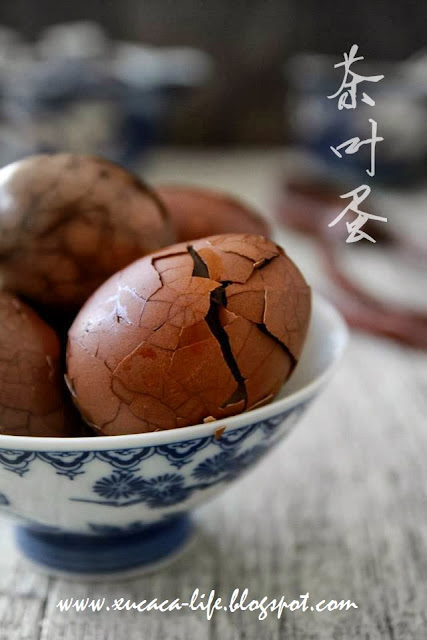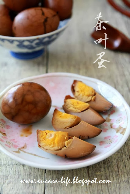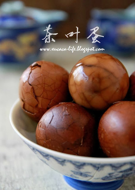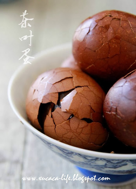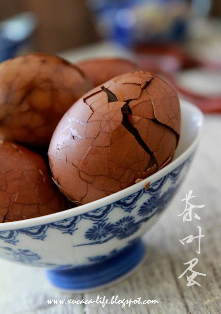 2)将煮熟的鸡蛋壳敲裂。然后把蛋放入慢烧锅(Slow cooker),加入茶包、清水(淹过鸡蛋)。加入适量的调味料。