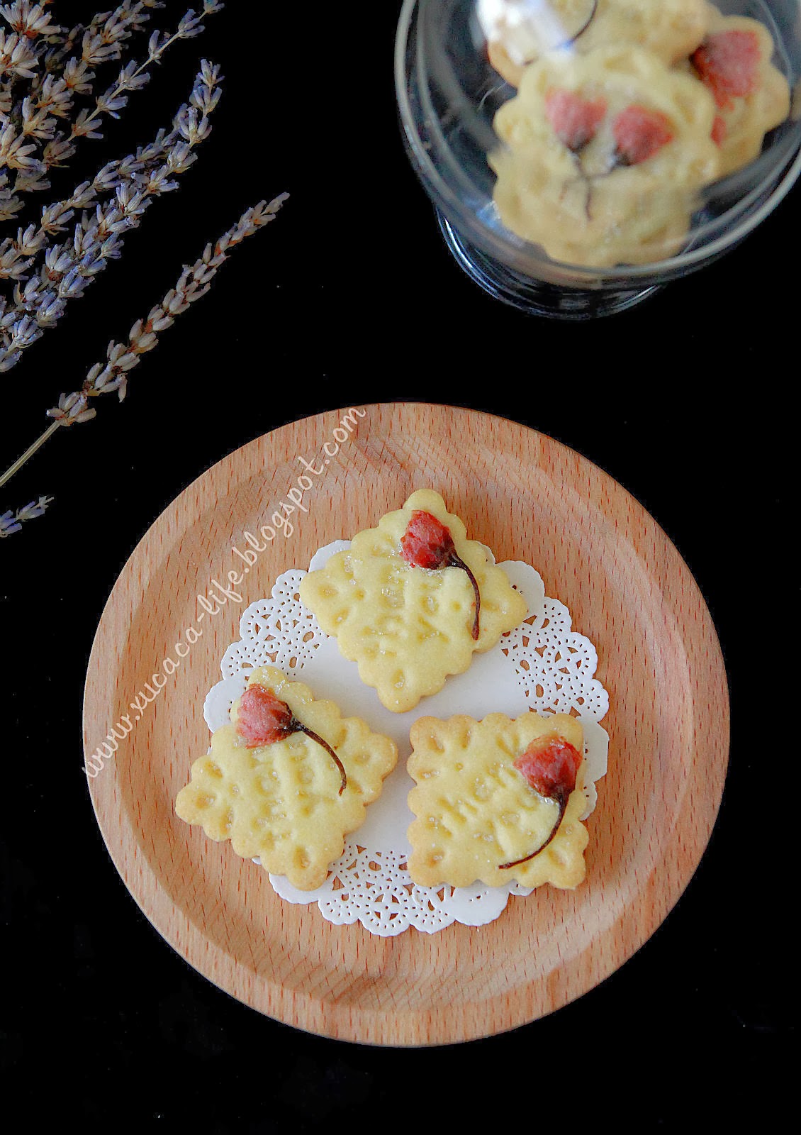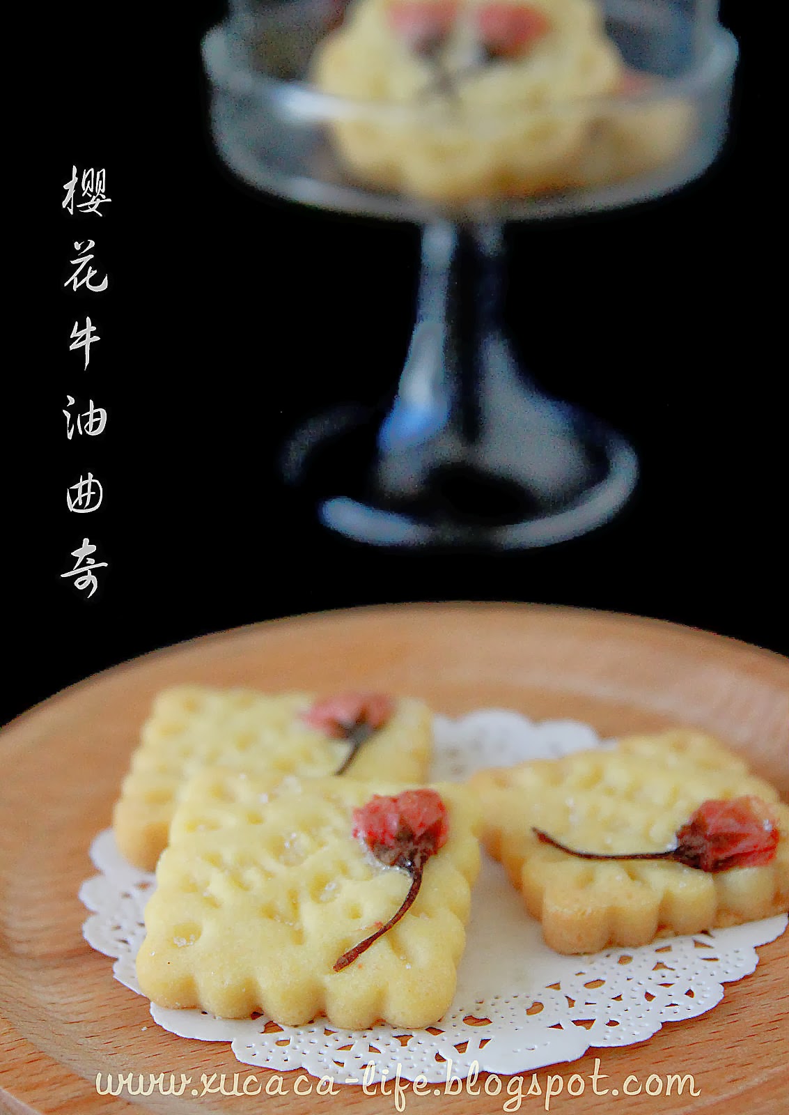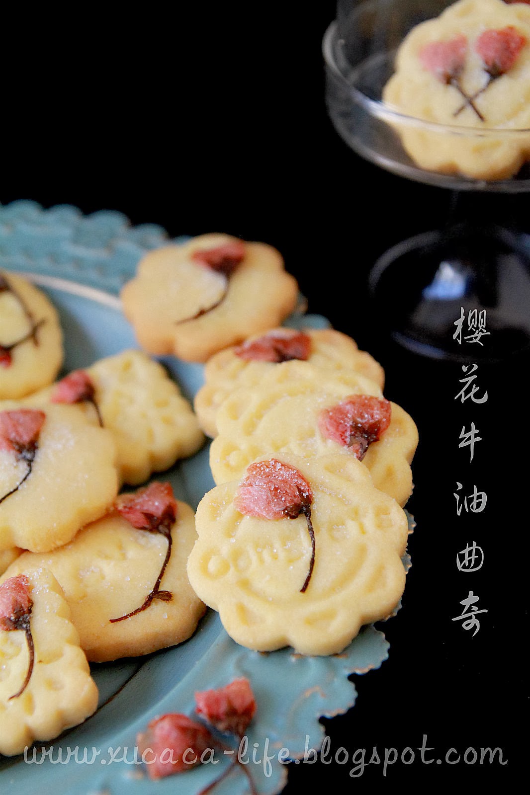 选了一道简单的牛油曲奇。加上盐渍干樱花的点缀。