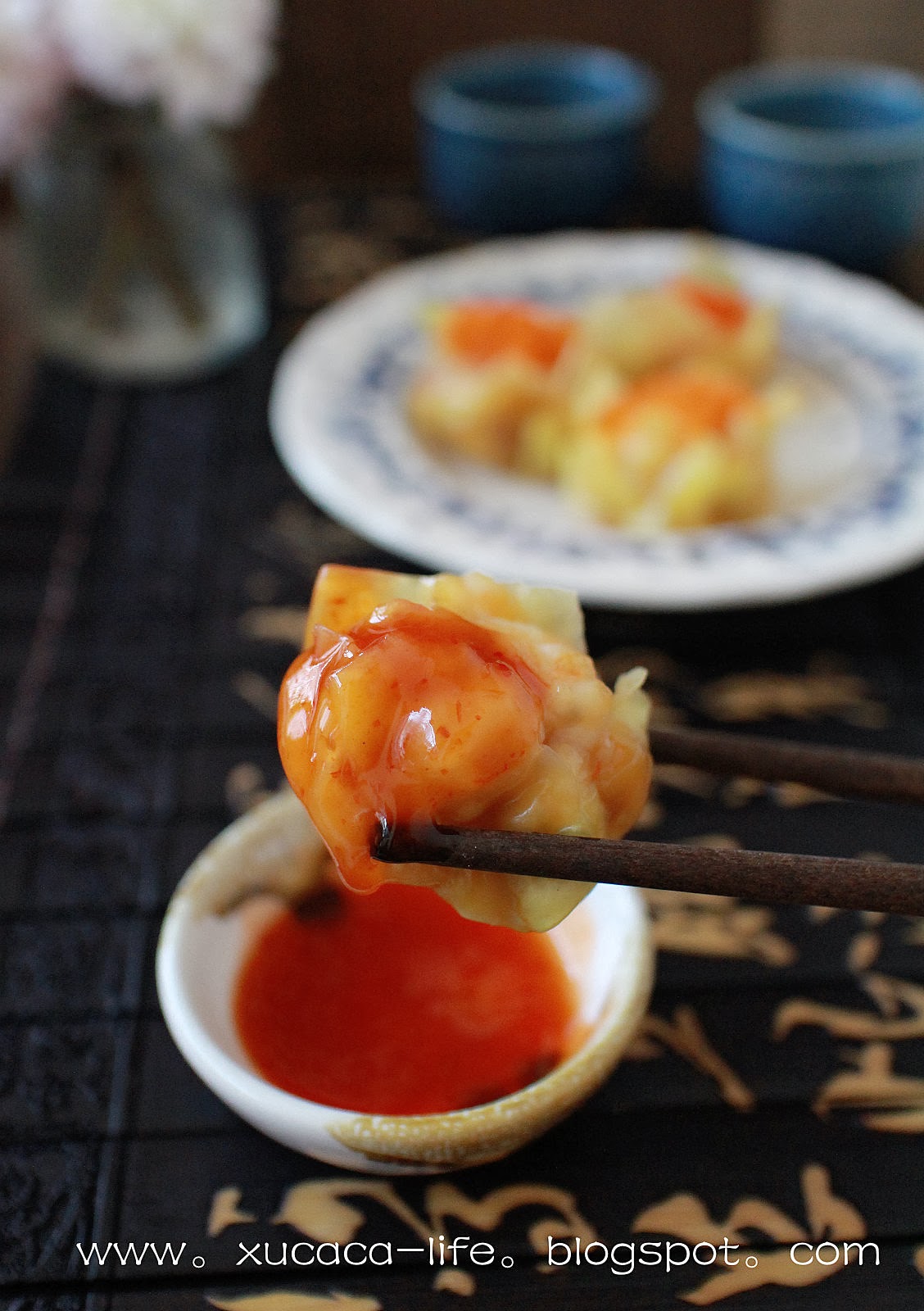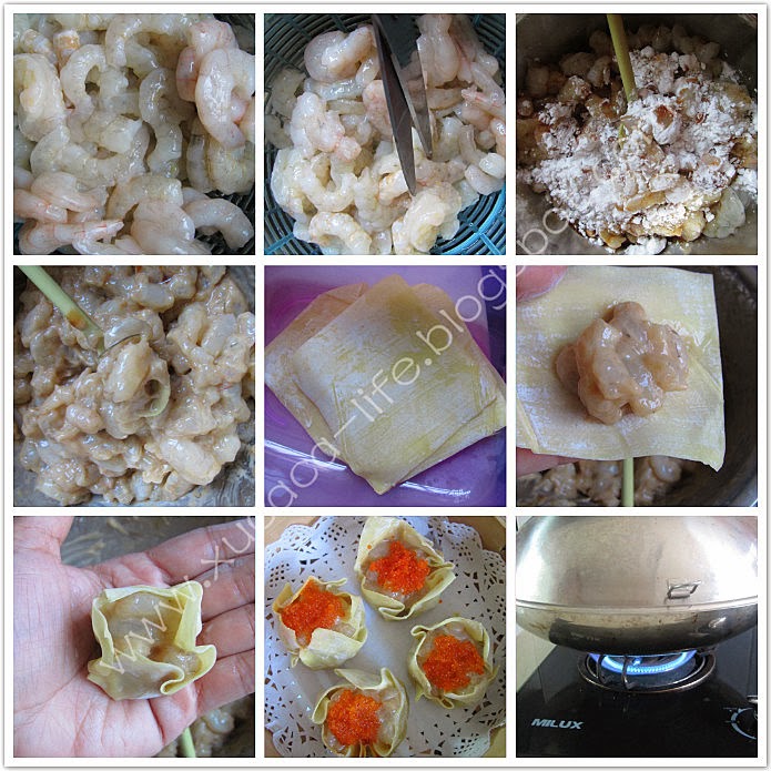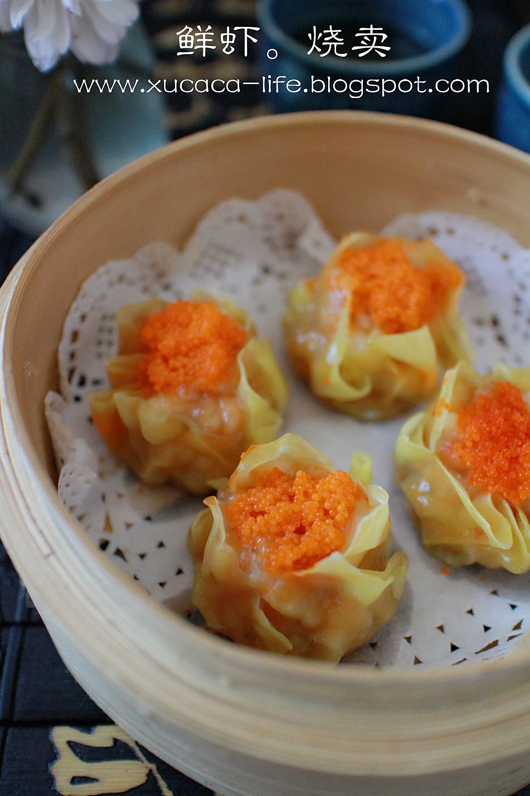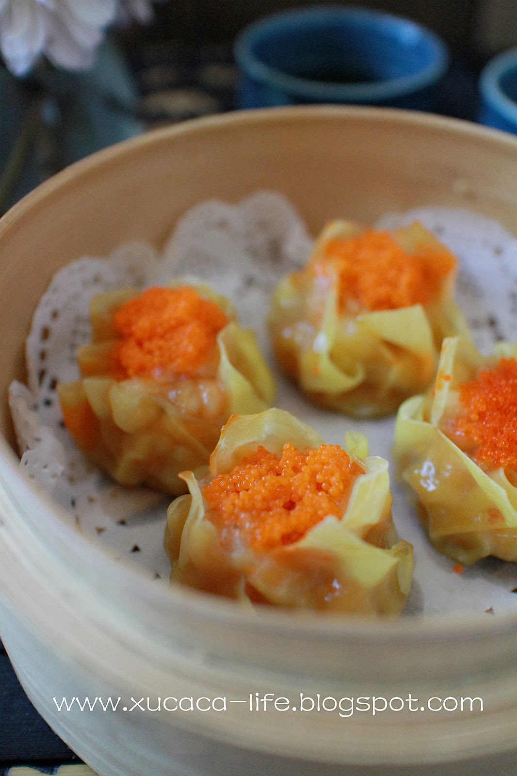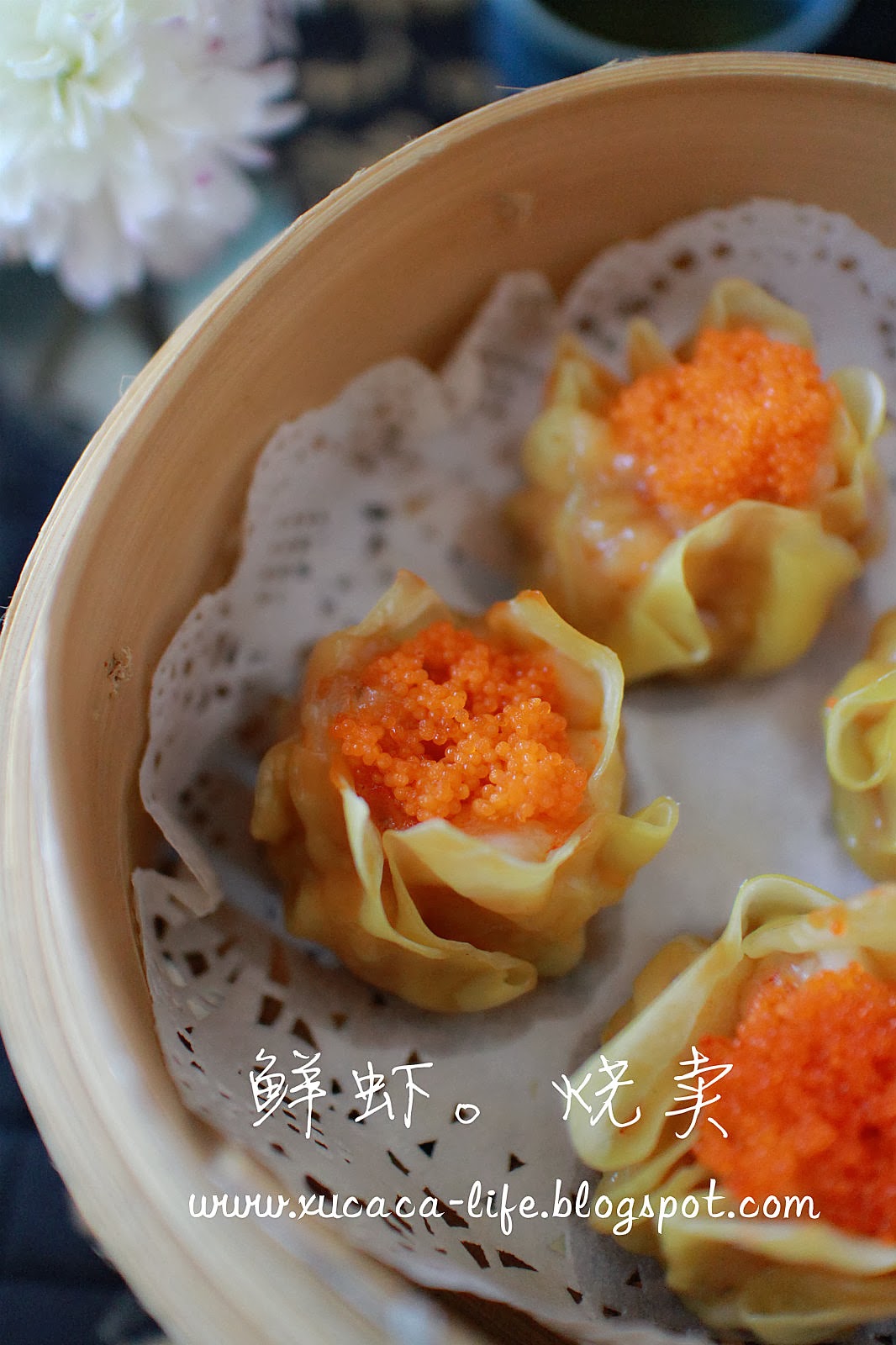 2)用一片云吞皮包一个烧卖,涅成烧卖形。表层加一些虾卵。