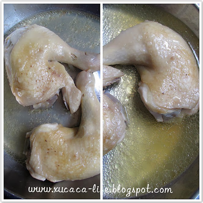 * 把盐、鱼露涂在鸡腿上,放入蒸锅里蒸熟。取出鸡肉,把麻油涂上。