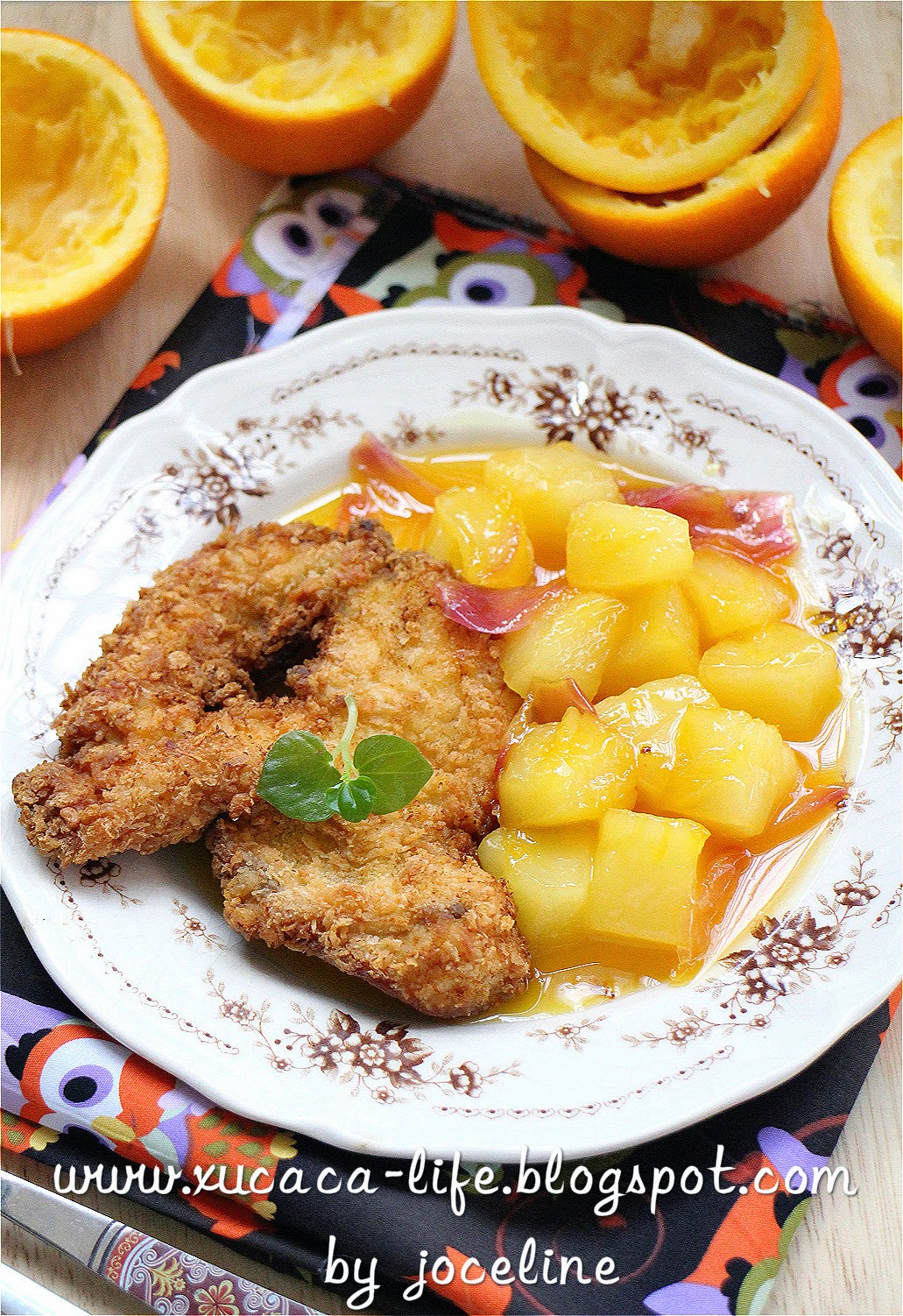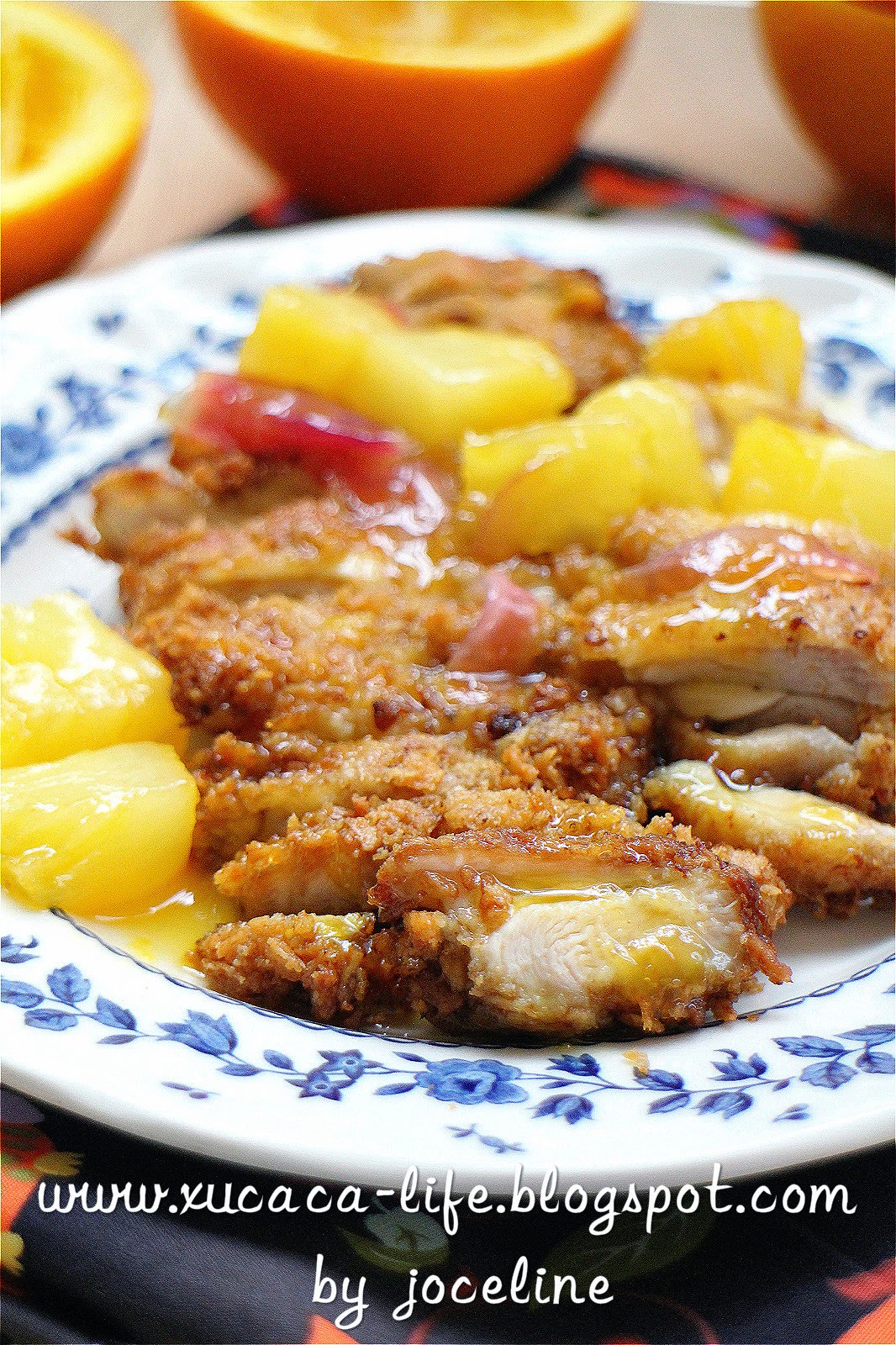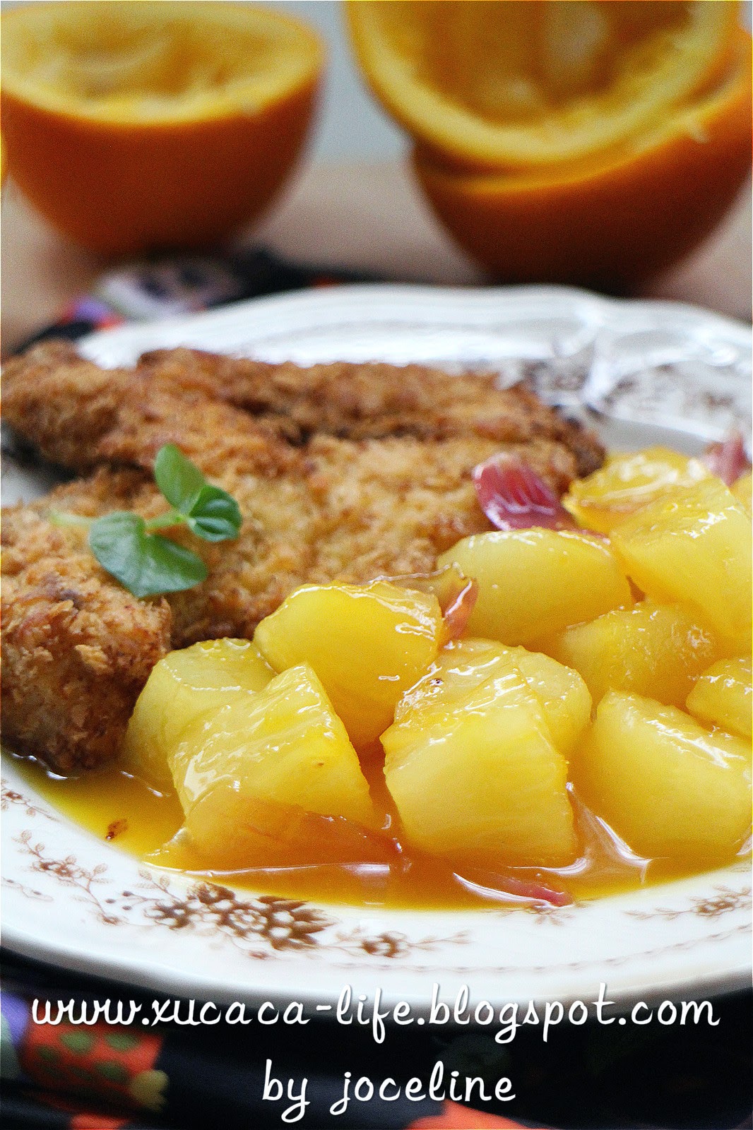 3)把以上准备好的炸鸡扒切成片,要吃炸鸡扒时,再把香橙酶汁淋上便可。