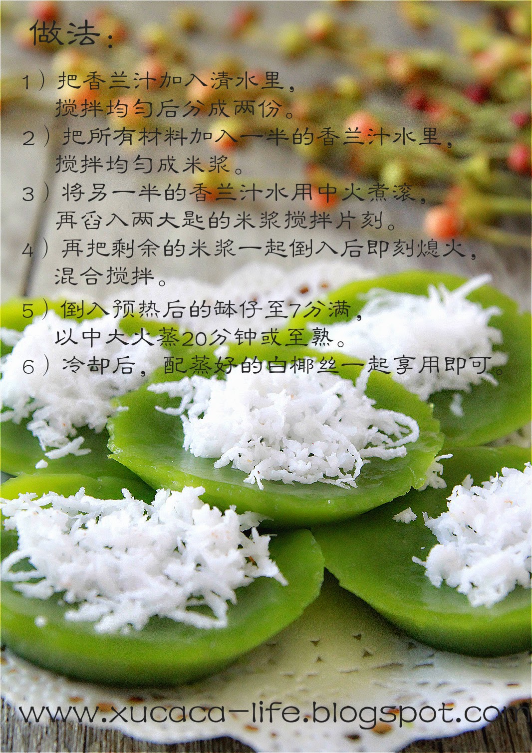 $ 0 0 最近几天感觉“家里”很有旺气。连续上的都是‘黄金’色的食物。嘻嘻 ~今天偏向‘环保’。翻了旧作,一个充满香气的香兰缽仔糕。尤其是这道出自Eileen家的好食谱。娘子好喜欢。小小分享:缽仔一定要抹上少许的油然后蒸热后才可把米浆倒入。Enjoy!