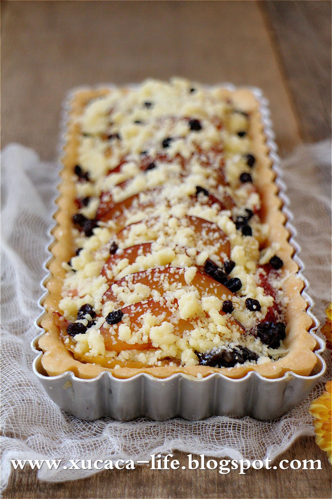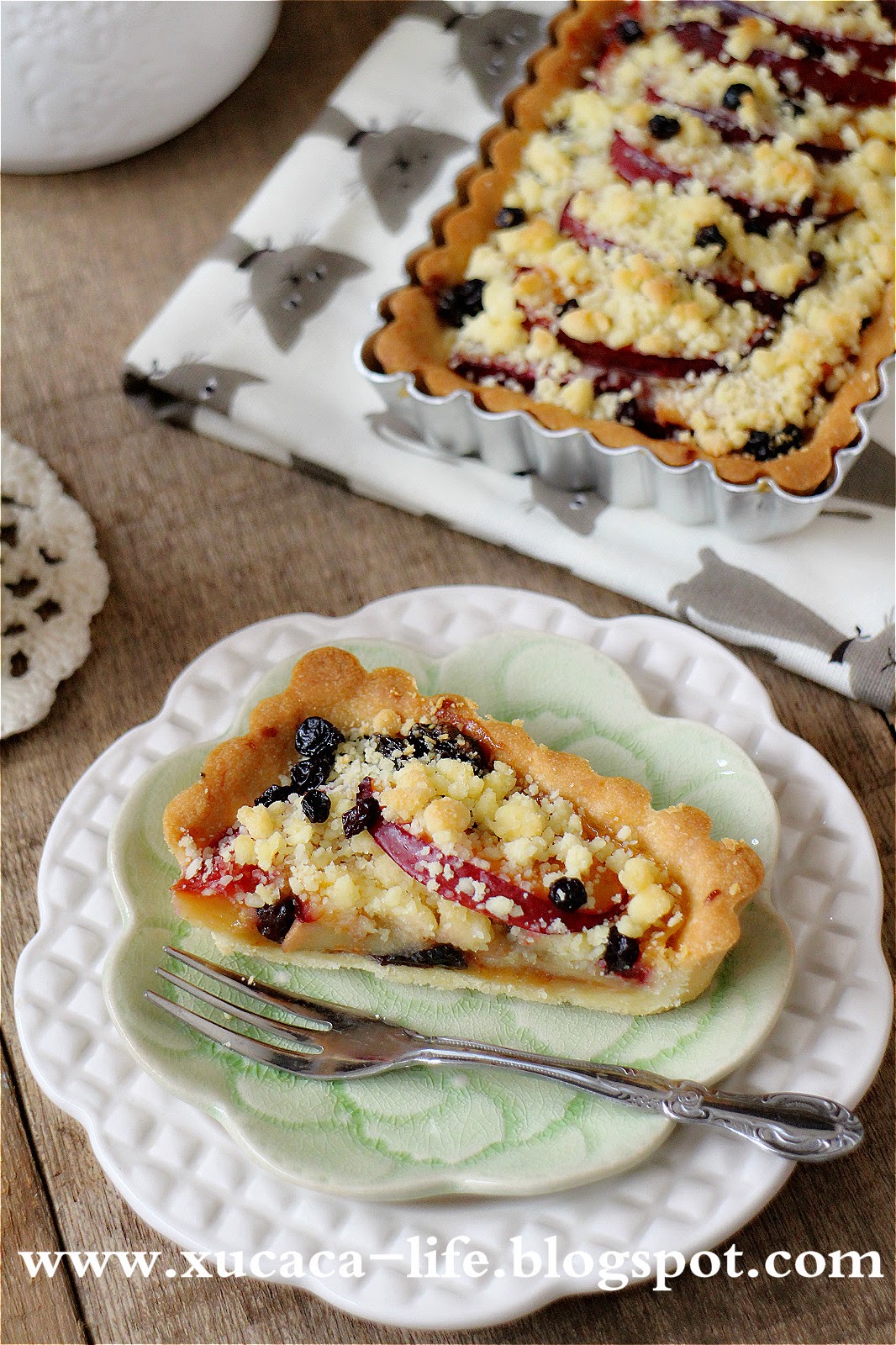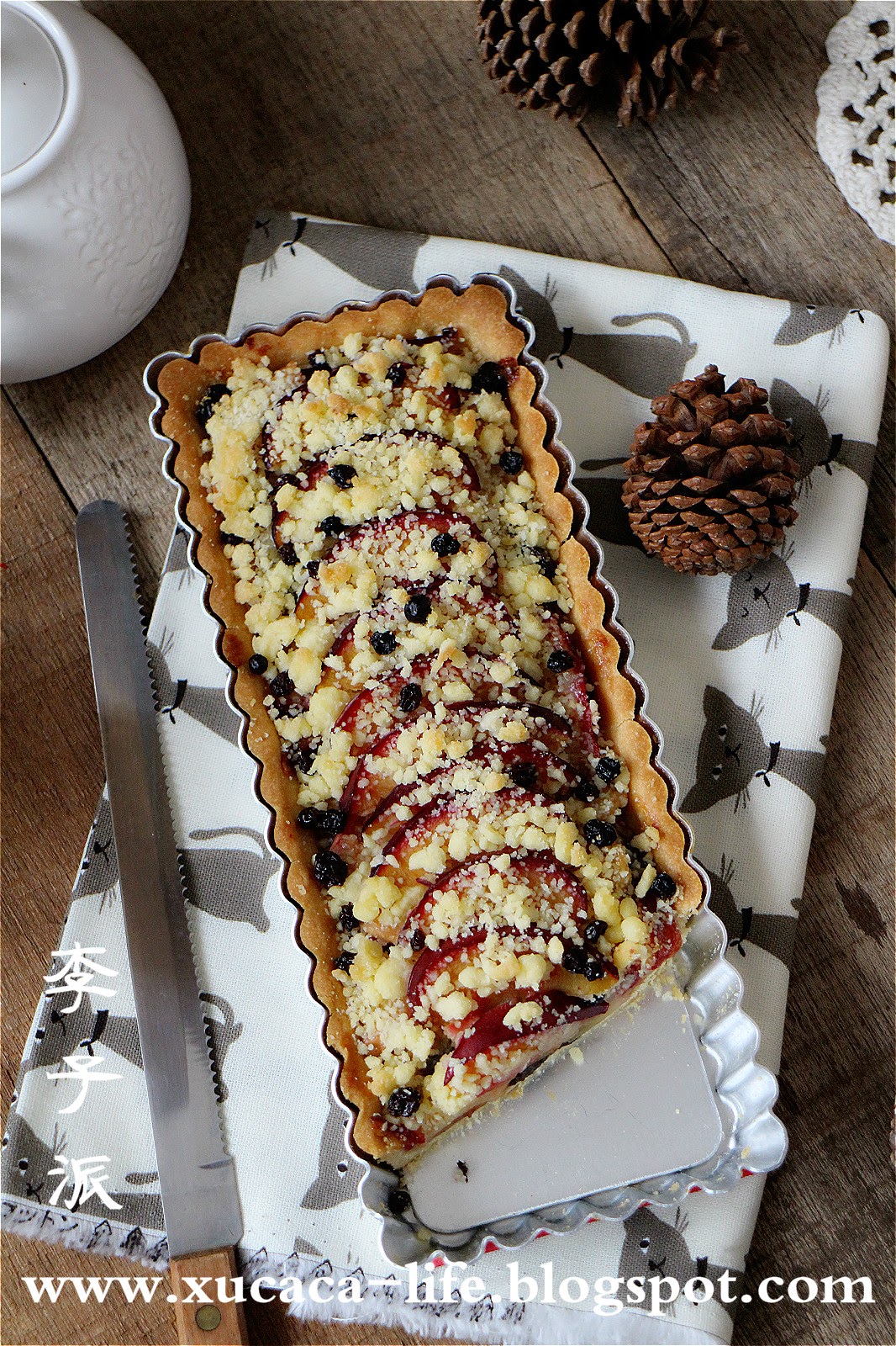 表层装饰:李子切片、奶油香酥粒、小葡萄干
