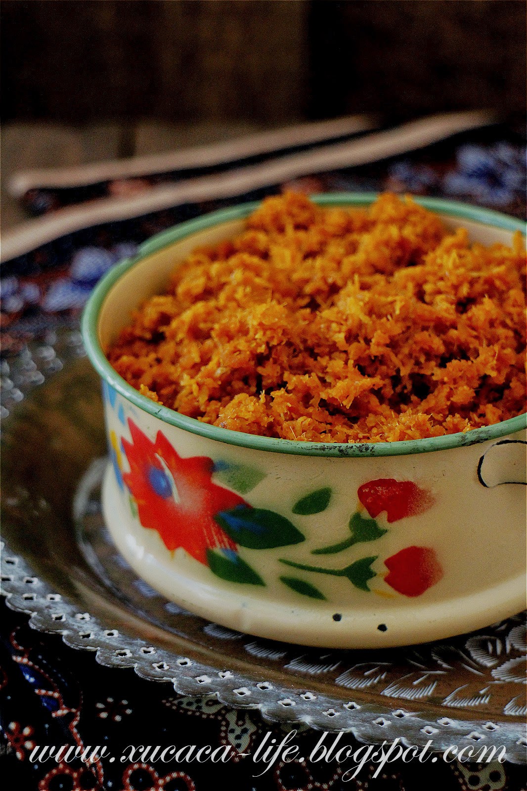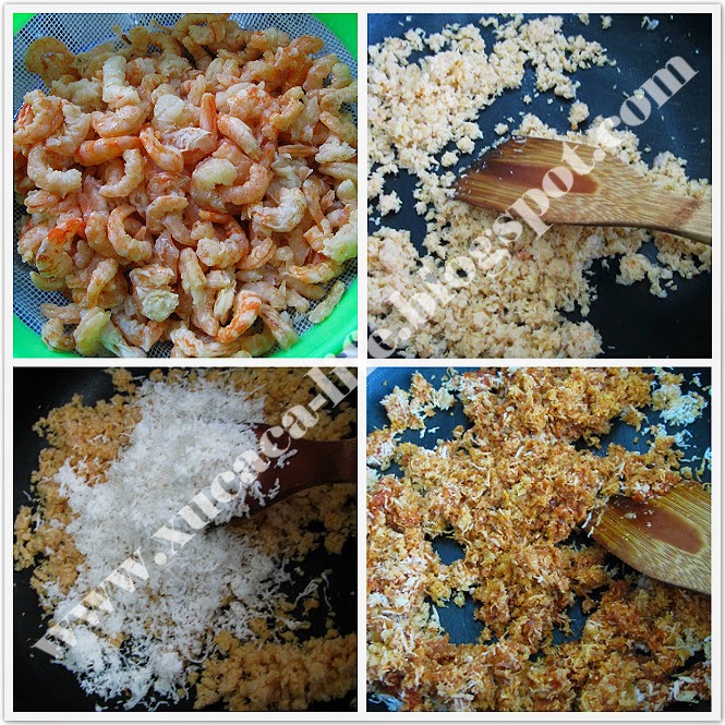 3)然后加入椰丝一起炒。最后加入适量的调味料,然后炒香至均匀,盛起备用。