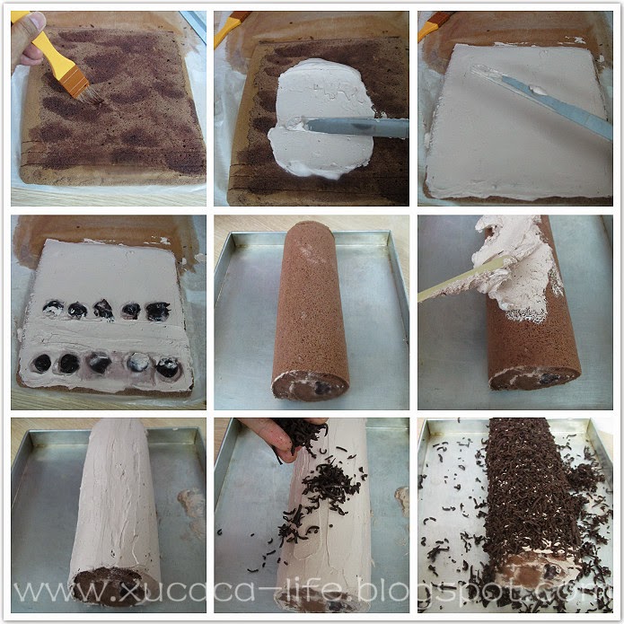 完全冷后才涂上一层的樱桃酒或酒渍樱桃汁,然后涂上奶油,放入樱桃,卷上。