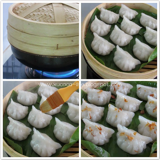 5)蒸炉加水开滚后,以中火蒸上10 - 12 分钟至菜粿变得有点透明色即可。