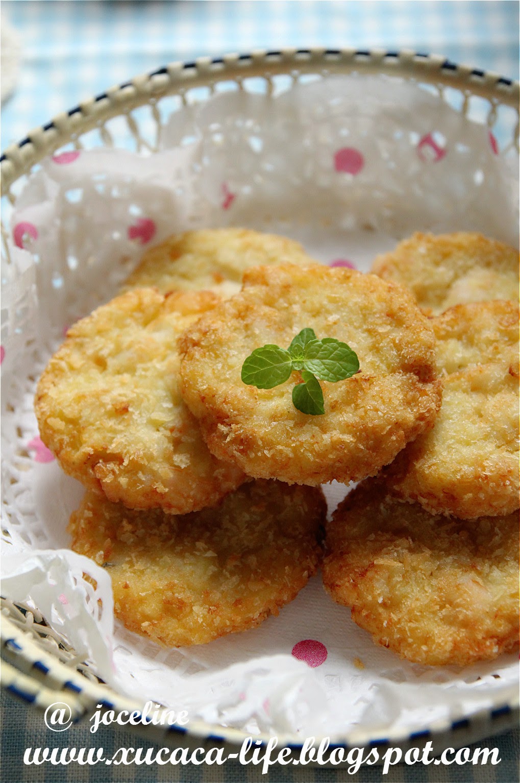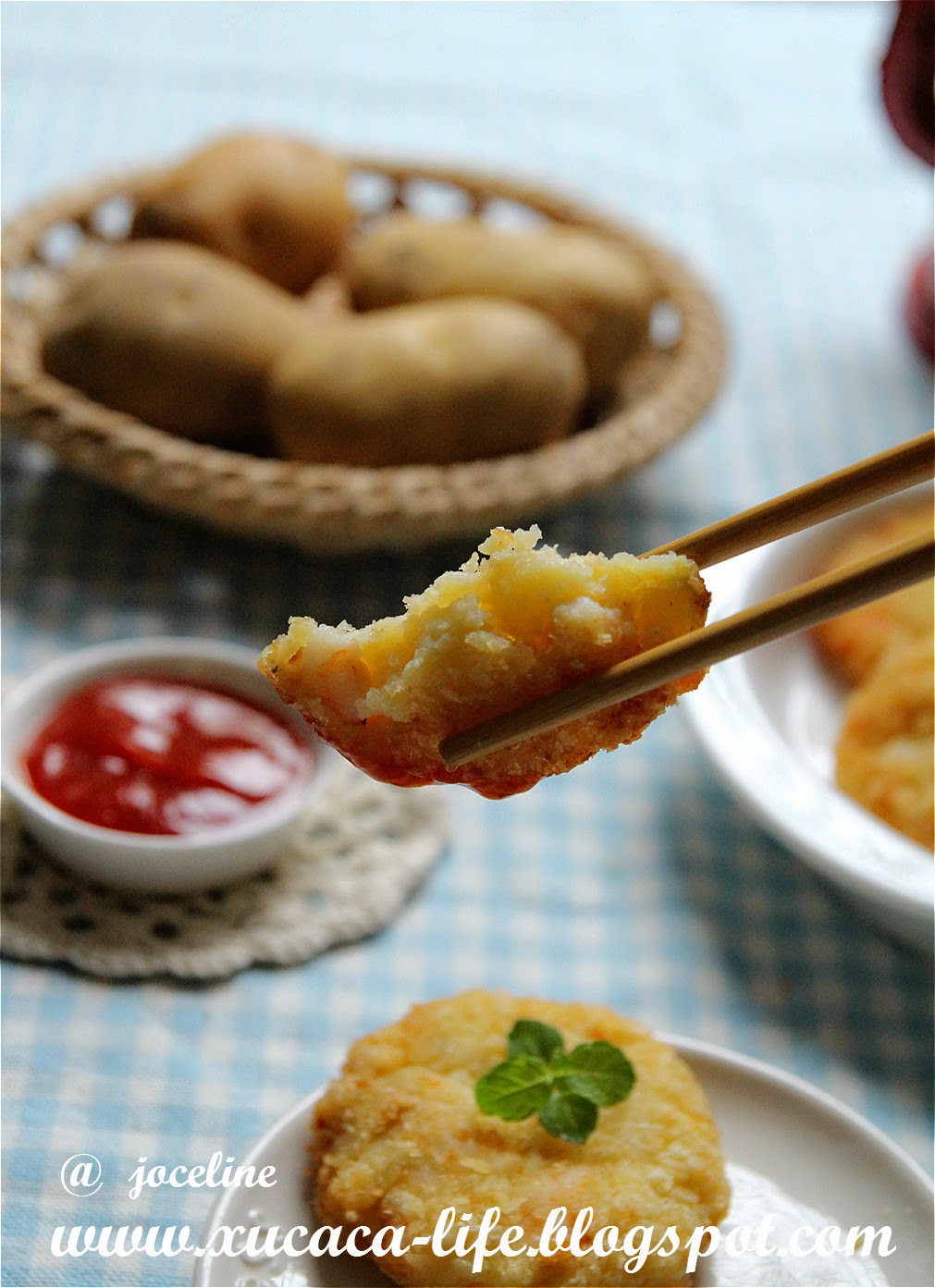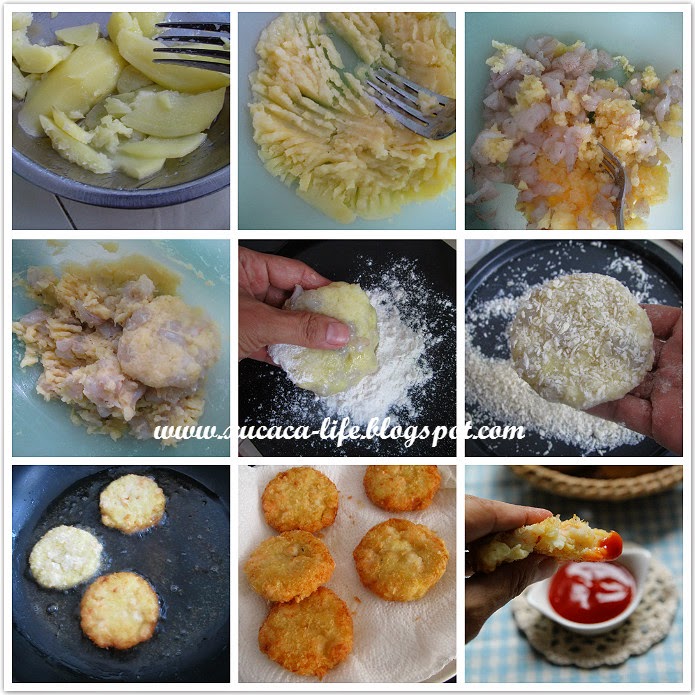 1)马铃薯蒸熟用叉子弄烂。然后把剪碎的虾仁加入搅拌均匀。