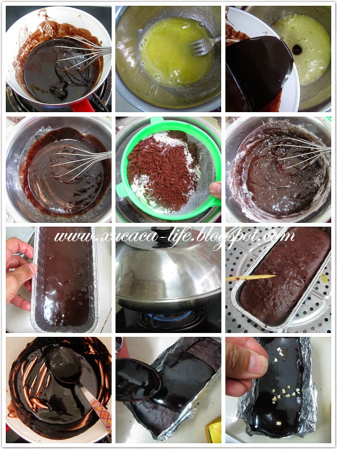 5)将巧克力面糊倒入模子里。然后放入滚锅里,蒸上30分钟。