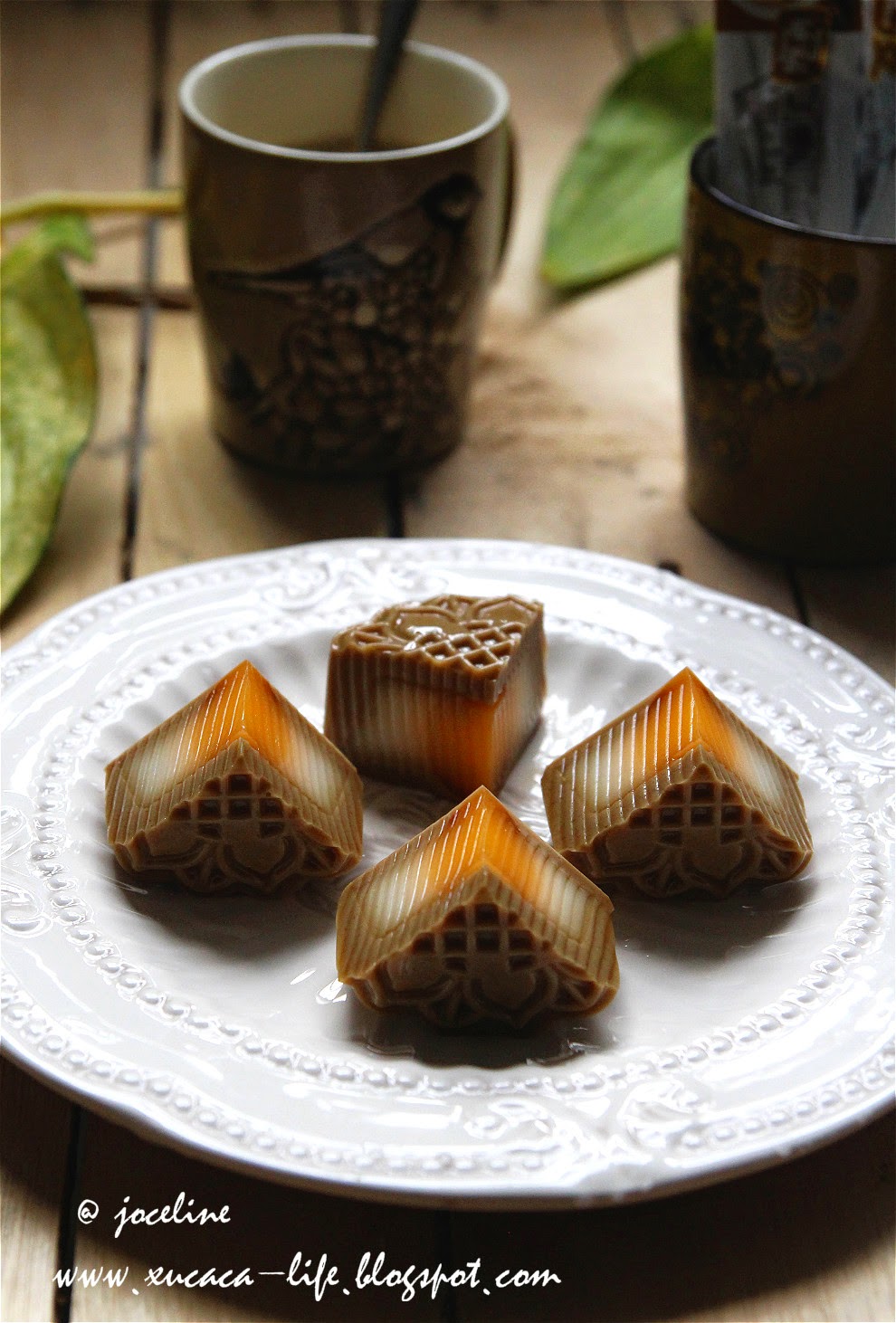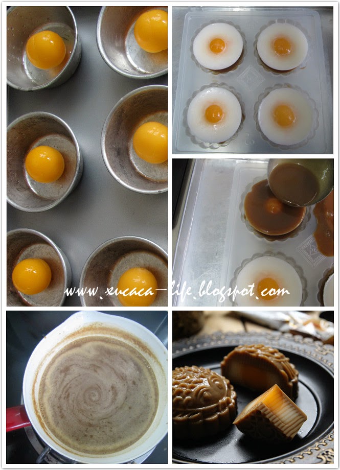 4)倒入少许的(3)白咖啡燕菜水在大月饼模里,等待稍微凝结,就放入一个杯子里的炼乳蛋黄馅。