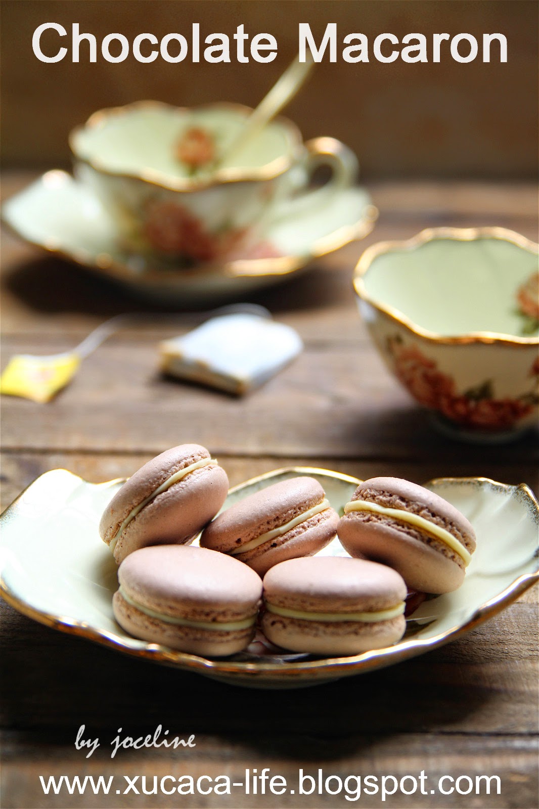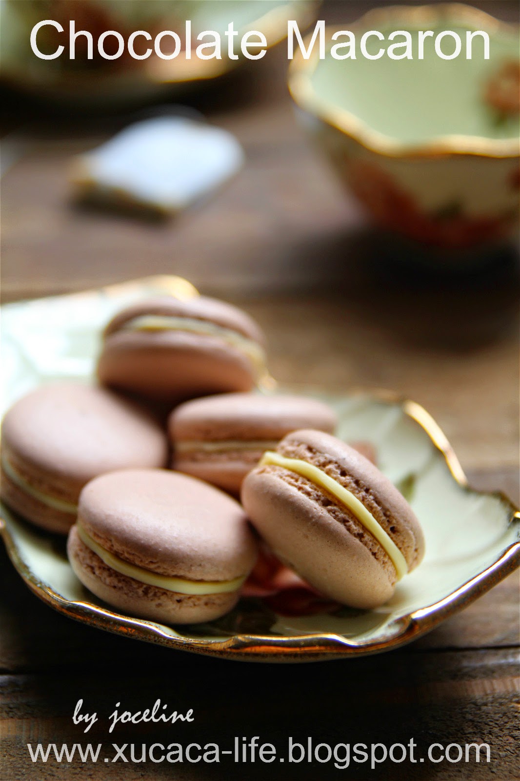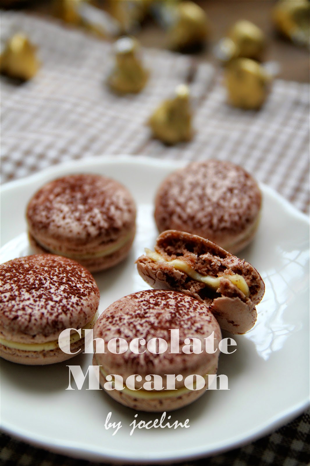 3)把蛋白霜拌入做法(1)的杏仁粉/糖粉/巧克力粉里,然后搅拌成均匀的杏仁巧克力面糊。4)把面糊装入挤花袋里,剪出约5mm的洞口,把面糊挤在画了圆圈圈印的烤盘上(烤盘铺上一层silicon纸)。