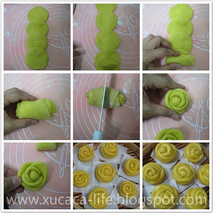 3)把一份小面团再分成6份。搓圆了,用木棍杆平。根据途中的步骤完成造型。