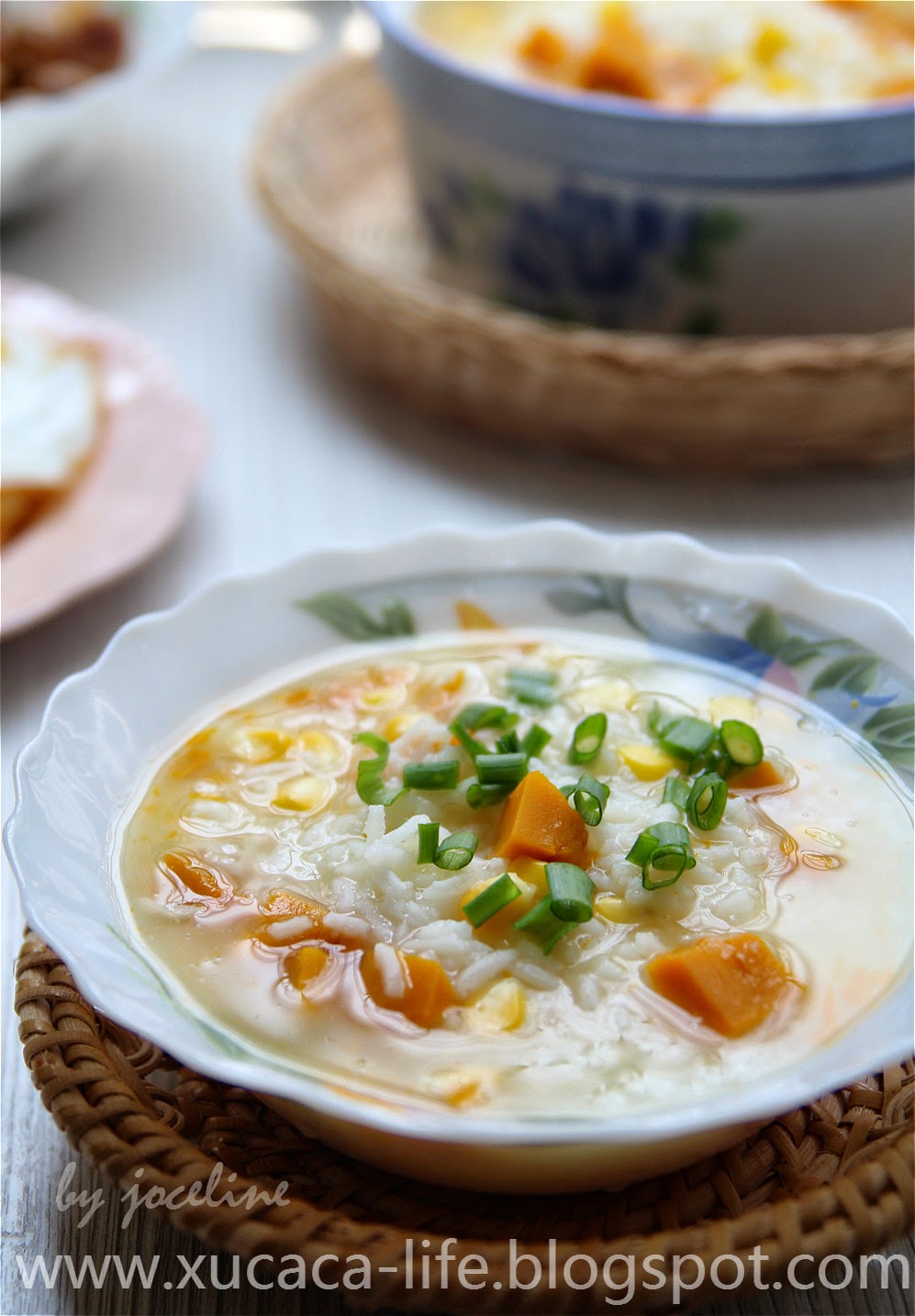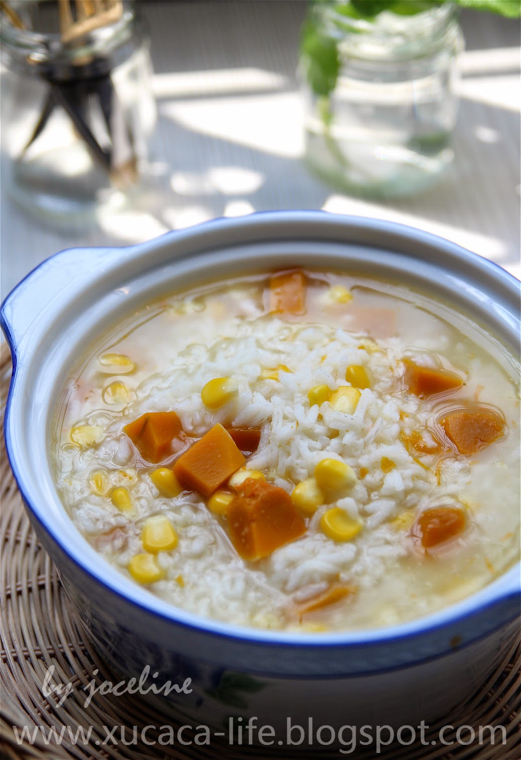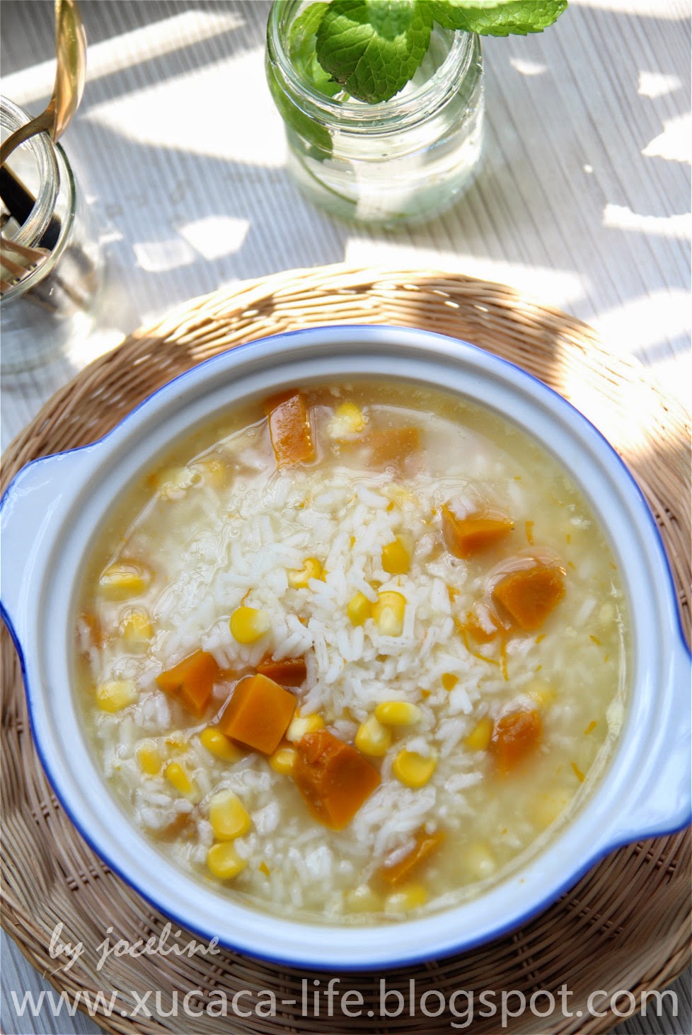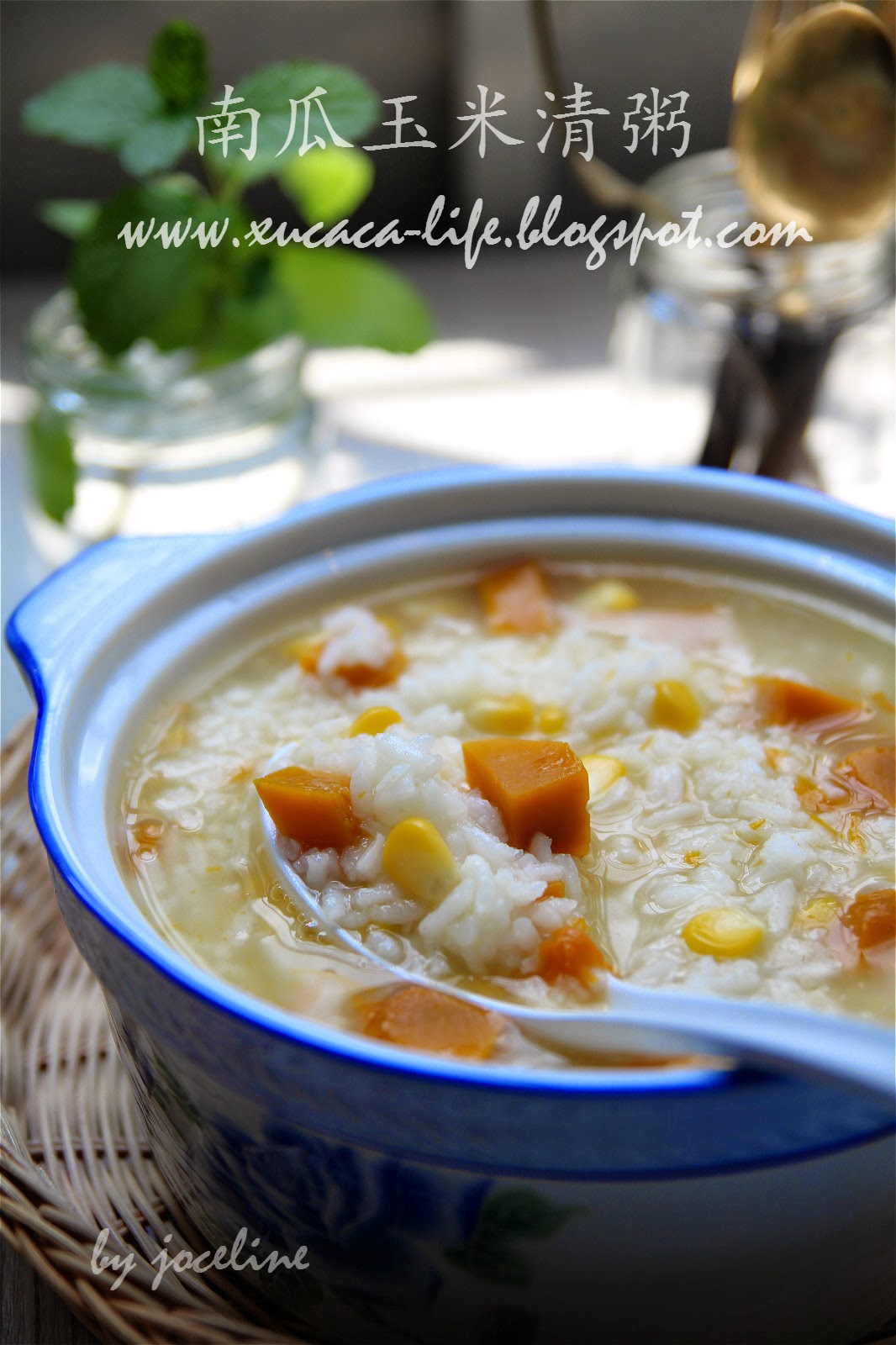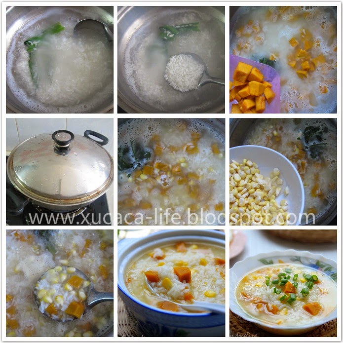 2)米粒开始有软,就把南瓜丁倒入锅里一起煮。