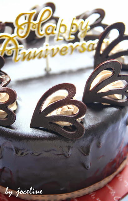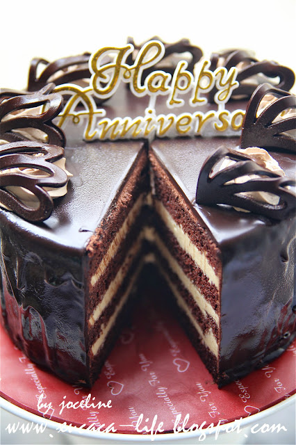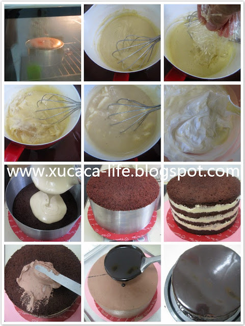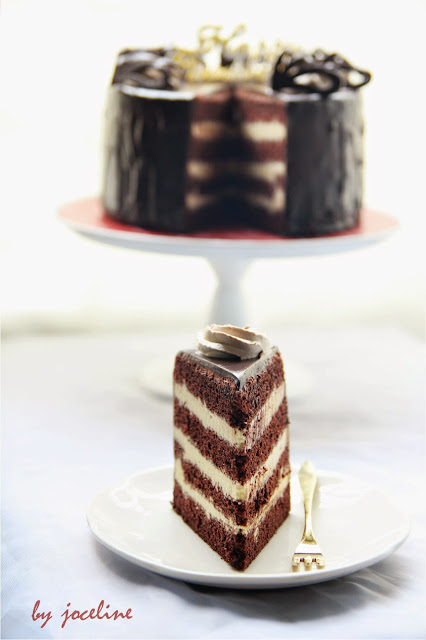 5。然后可脱掉慕思模,将打发的巧克力鲜奶油涂抹在蛋糕上。 整个蛋糕涂抹均匀抹平,并冷藏最少20 - 30分钟。