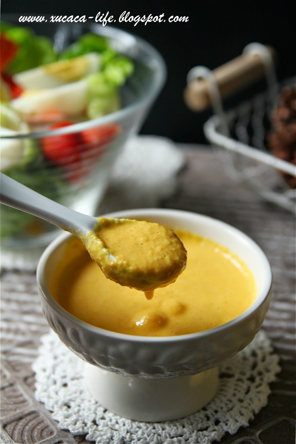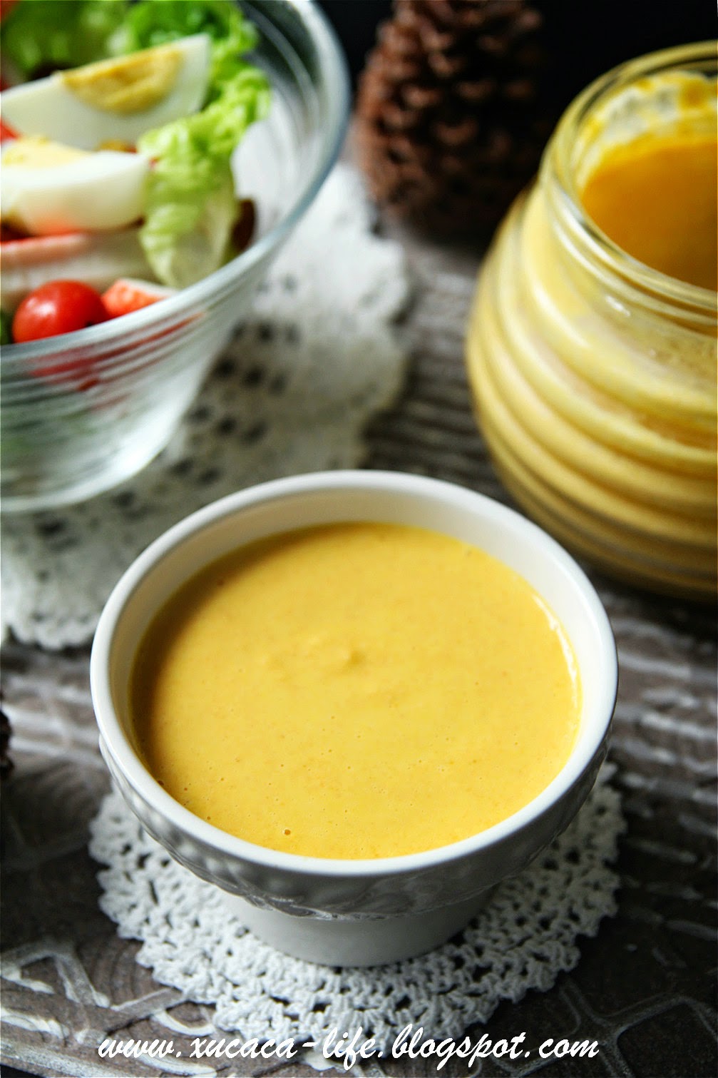 30克 白芝麻,炒香 1/2 条 红萝卜,切块 1/2 个 褐洋葱,切块 1瓣 蒜头,切块 50克 细砂糖 350毫升 太阳花由 100毫升 糙米醋 130毫升 生抽 做法: 将所有材料放入搅拌机搅拌均匀即可。 温馨提点: - 不同的油或醋的使用将会影响成果的味道。避免用味道过浓的橄榄油(extra virgin oil)。 - 将做好的沙拉酱,密封干净的罐子,收进冰箱可耐1星期之久。