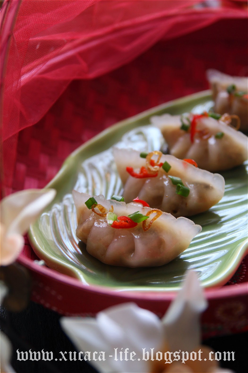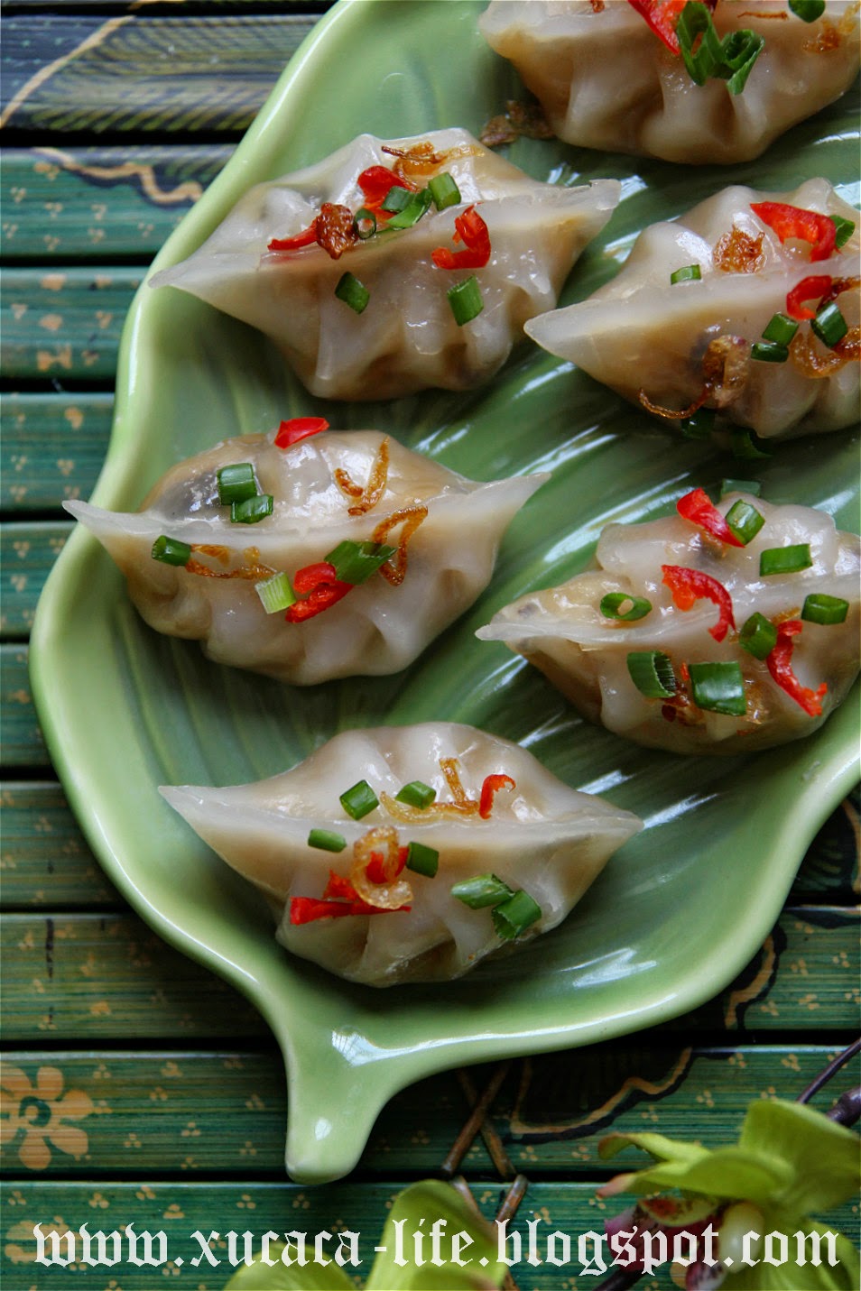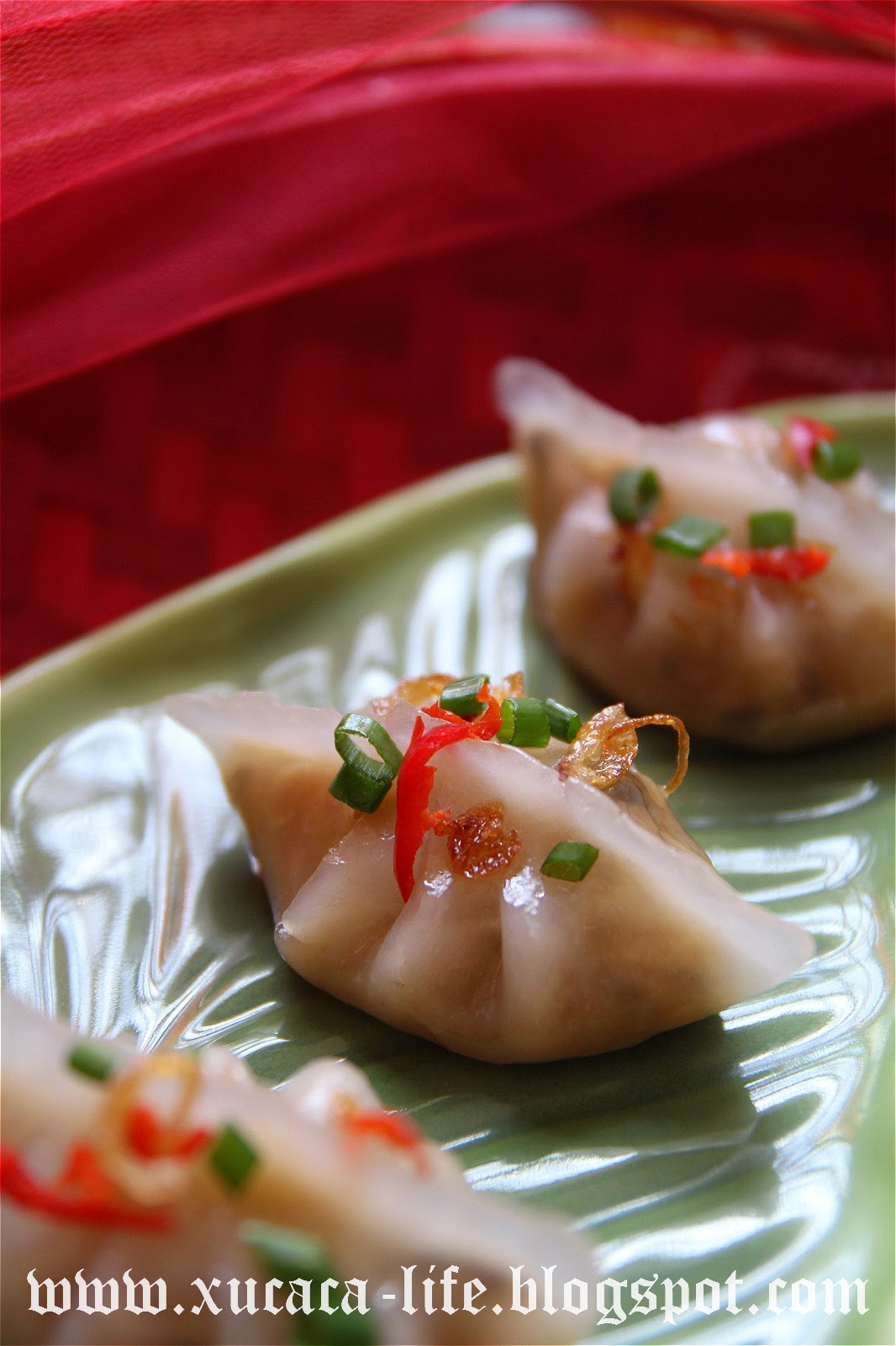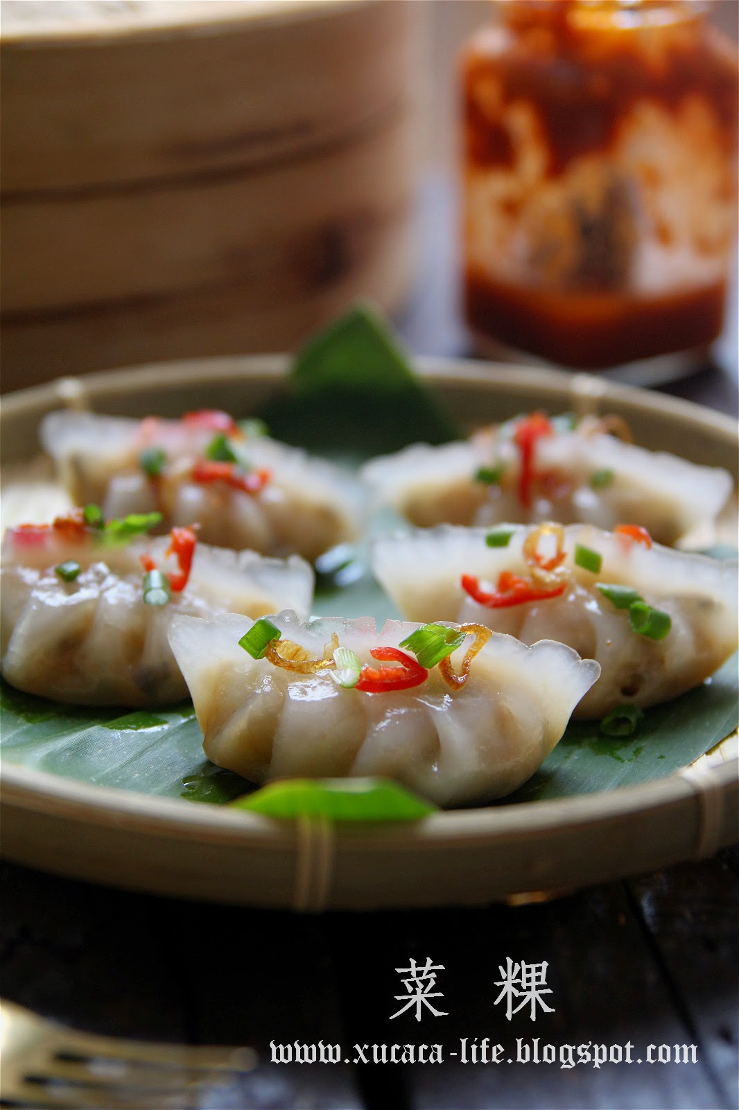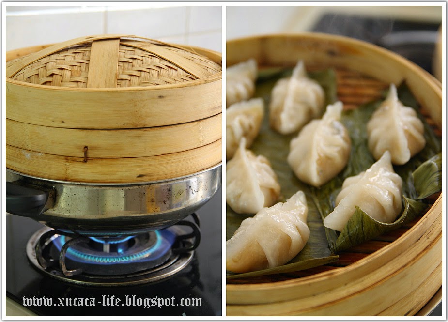 5)蒸炉加水开滚后,以中火蒸上10 - 12 分钟至菜粿变得透明即可。如果小个的菜粿 蒸8-10分钟即可。