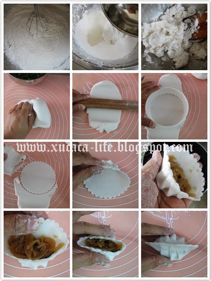 4)把面团分成小份,搓圆压平后,盖出圆形状,包入适量的馅料。捏出形状即可。