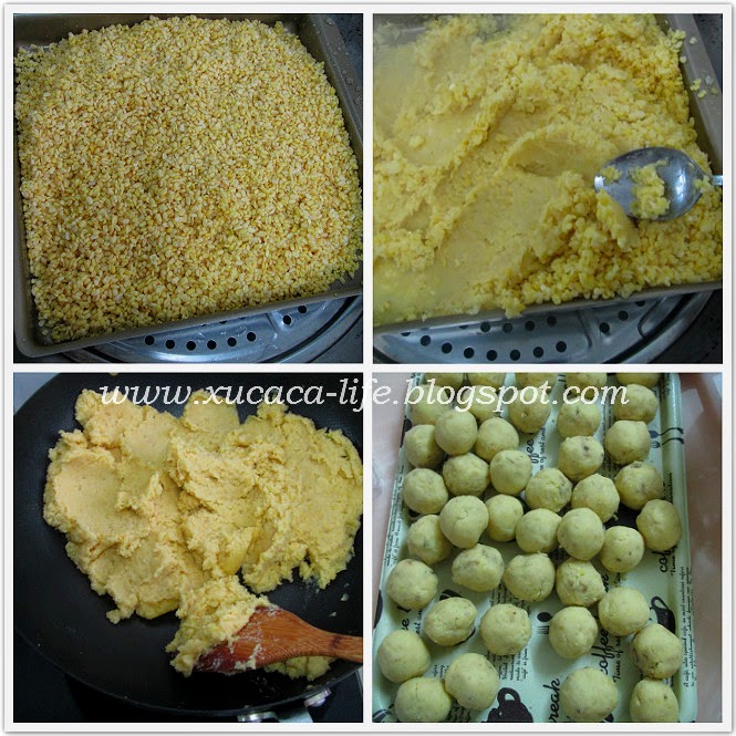 **番薯泥和绿豆茸已经熟的。只需把搅拌成面团的糕皮蒸熟即可**
