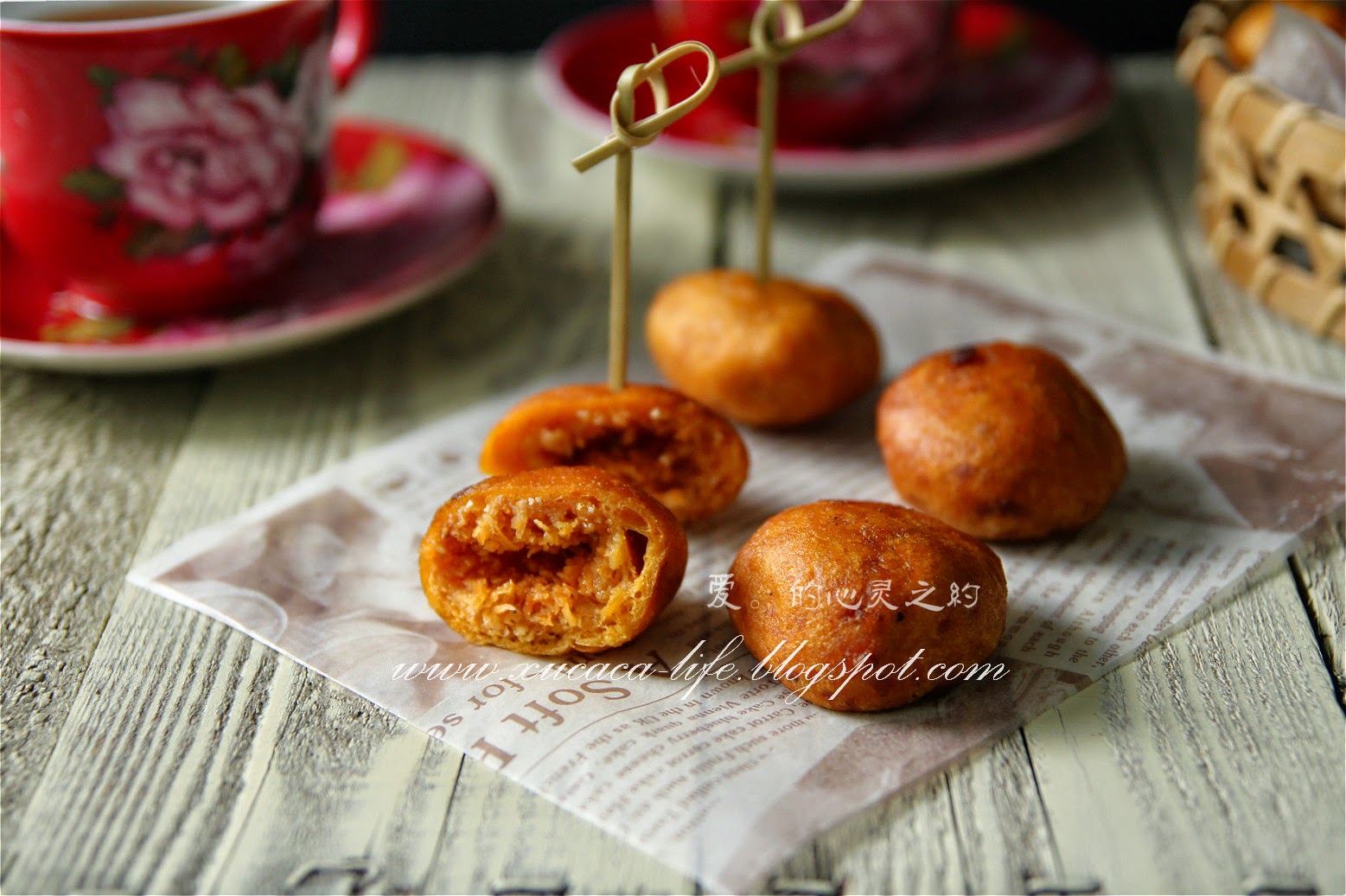 手摸上少许的油,把小面团搓圆,压扁包入适量的三巴虾米馅料。再搓圆。