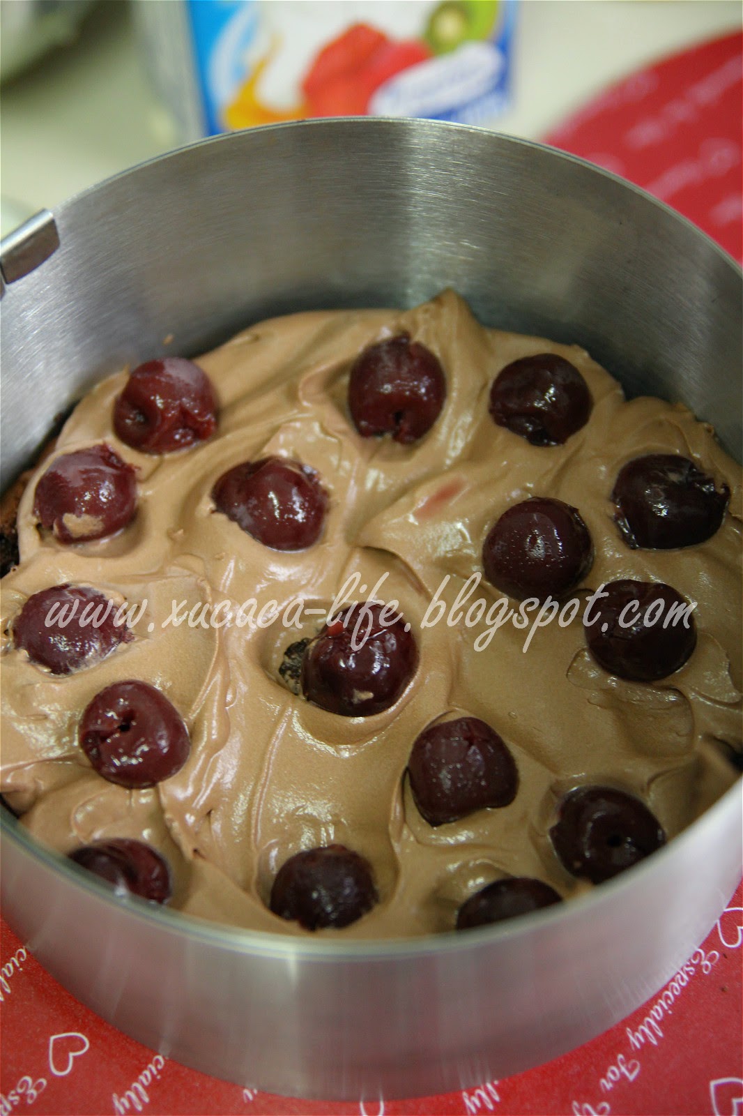 1) 把蛋糕体平均横切4片,在慕思模里放入一片巧克力蛋糕,再倒入巧可力慕思。然后均匀摆入酒渍樱桃。