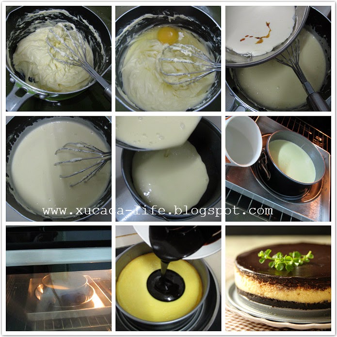 4)将乳酪面糊倒入饼干底上,用水浴法,以160度烤约60分钟。