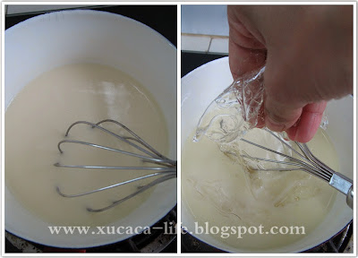 4)加温后(不可以煮到滚),把做法(1)的吉利丁片挤干水,然后加入锅里,搅拌至吉利丁片完全熔化即可熄火。