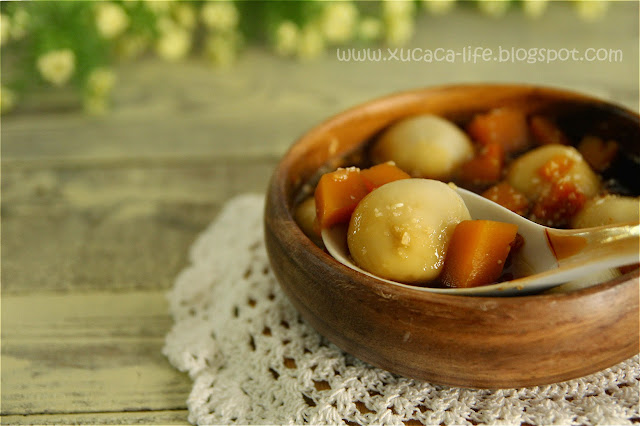 有如这道汤丸。因为很爱马六甲椰糖香,所以就用了椰糖煮糖水。