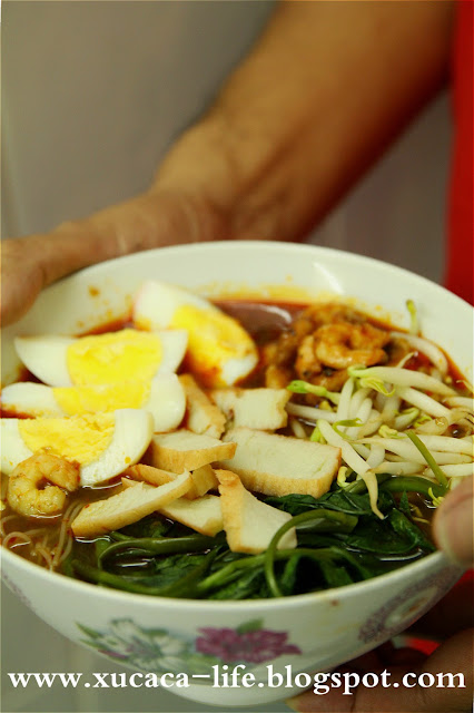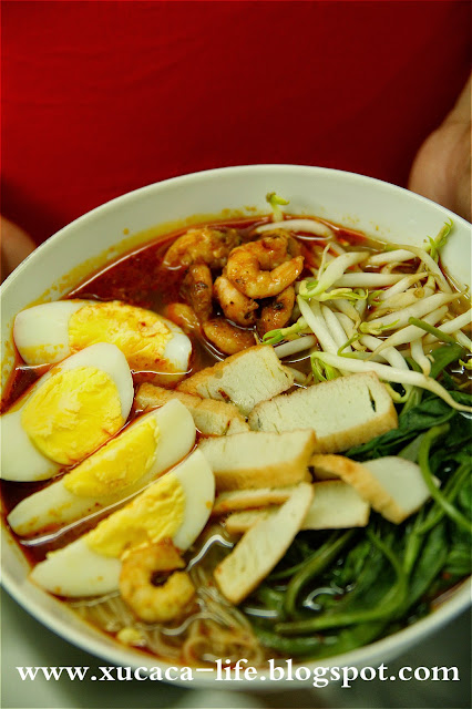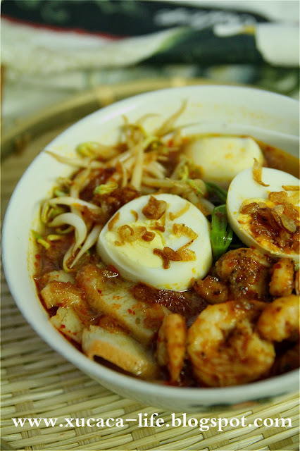 ** 再加上熟煮蛋、鱼饼、炒香的虾仁、蕹菜、豆芽。再淋上虾汤。撒上少许的香油葱,配上辣椒糊即可享用 **