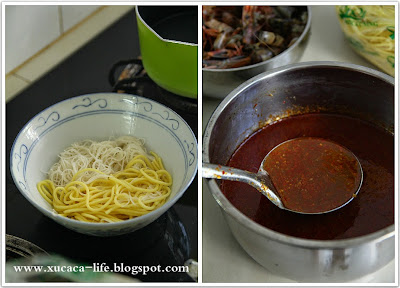 ** 加入适量的辣椒糊和适度的调味料一起煮 **